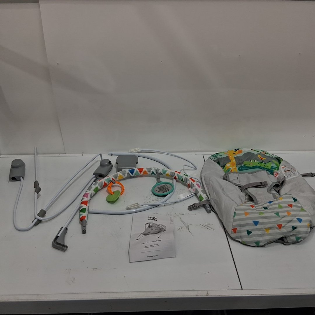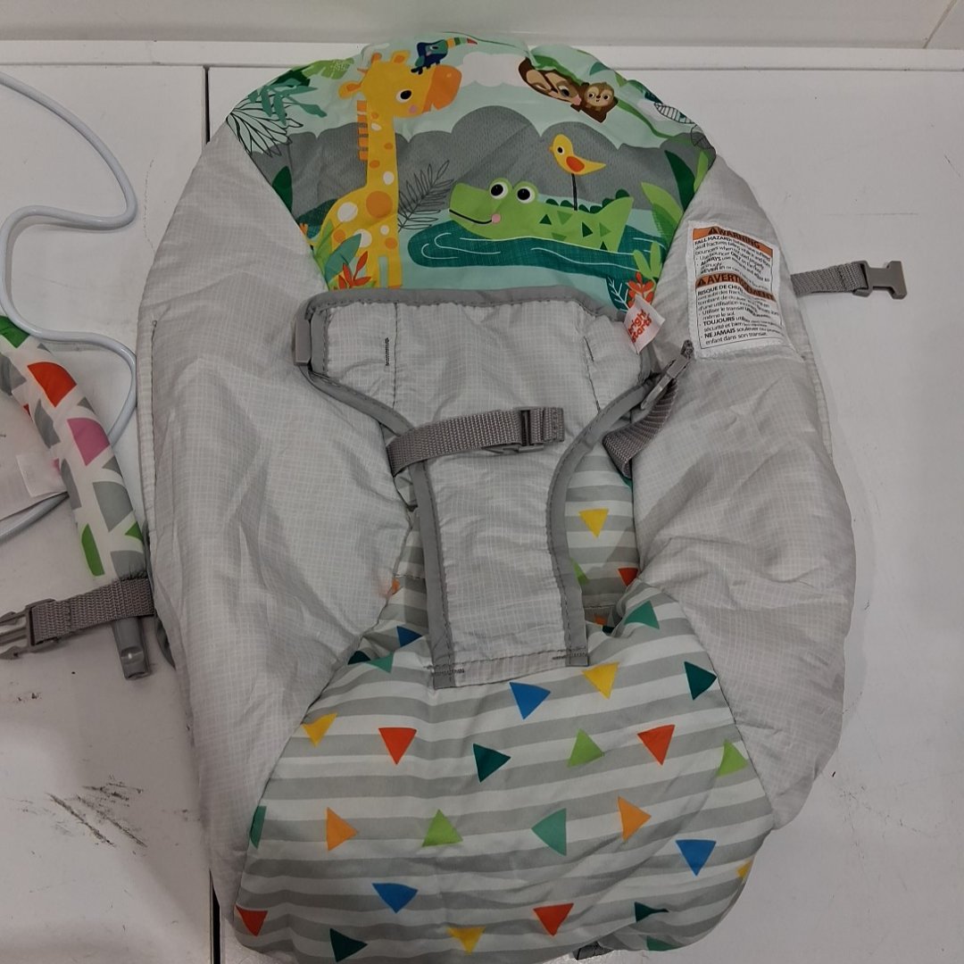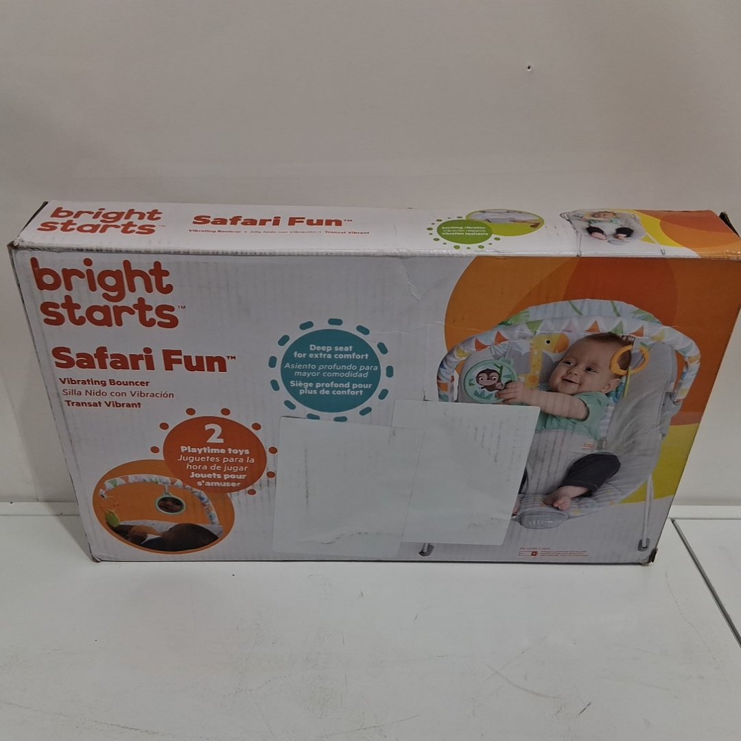 BRIGHT STARTS safari fun PORTABLE 3-POINT HARNESS VIBRATING BOUNCER WITH TOY BAR - Safari/Multicolored (MODEL: 12204)