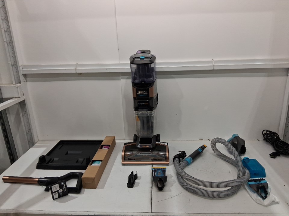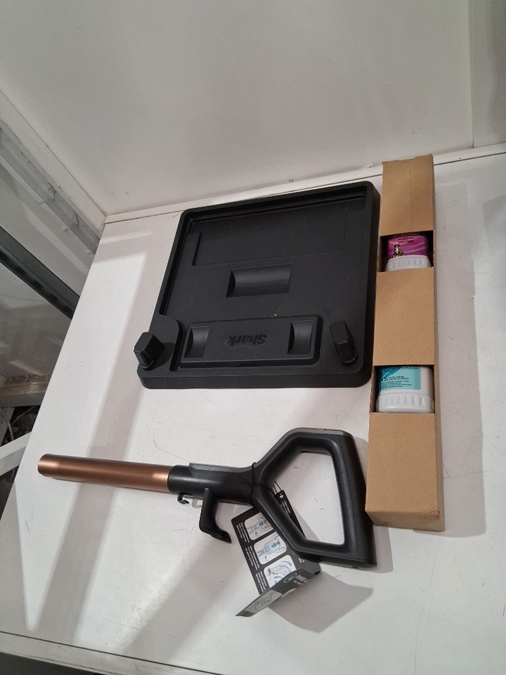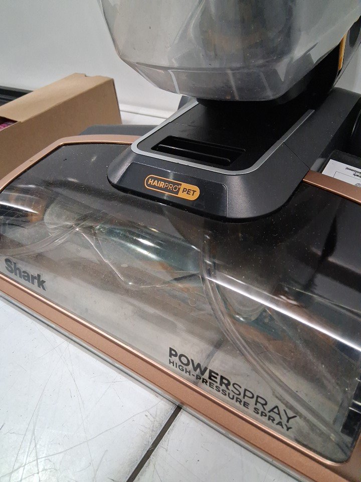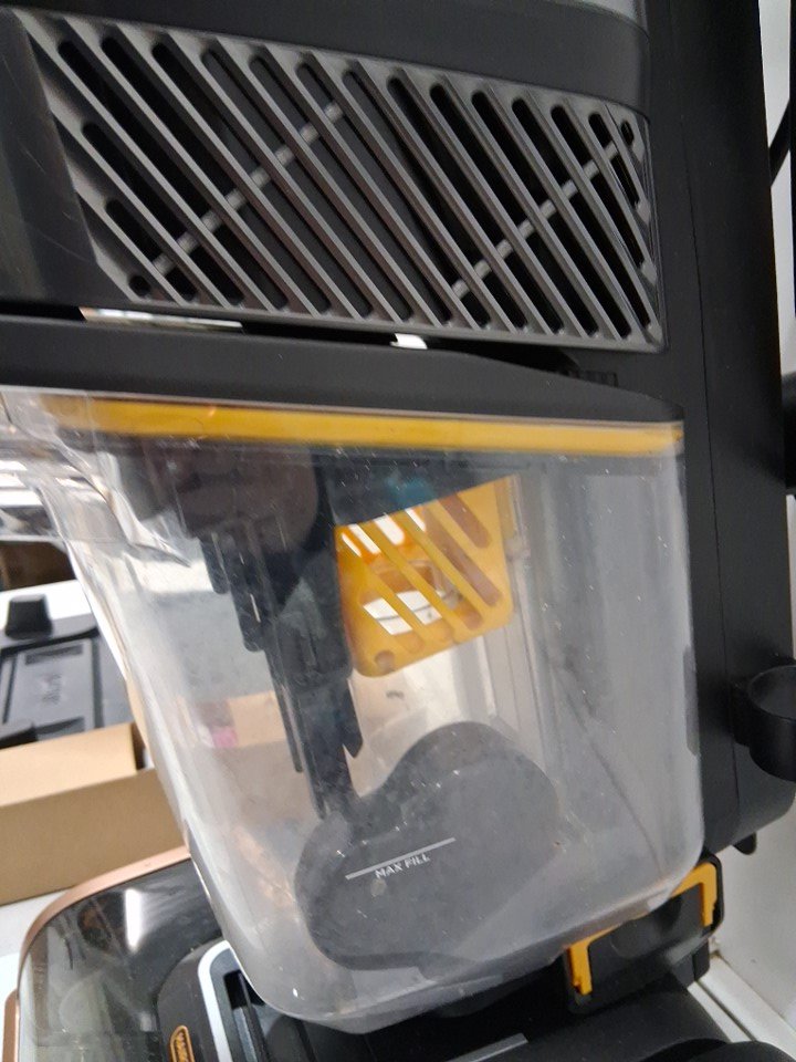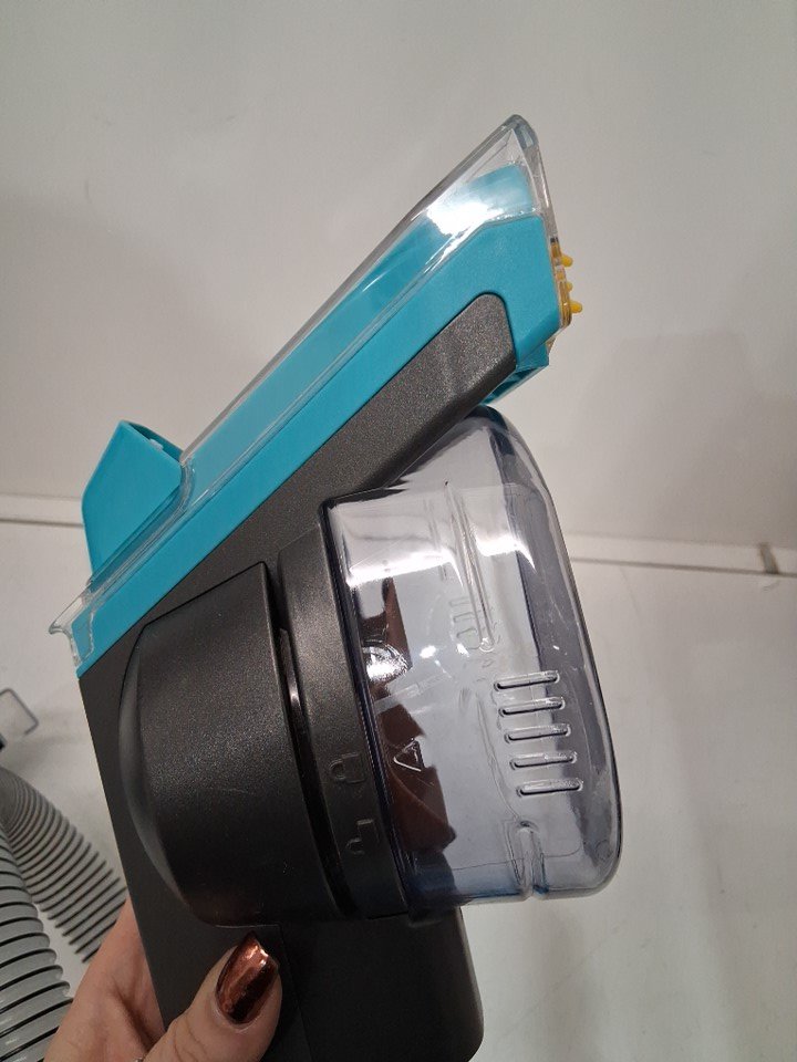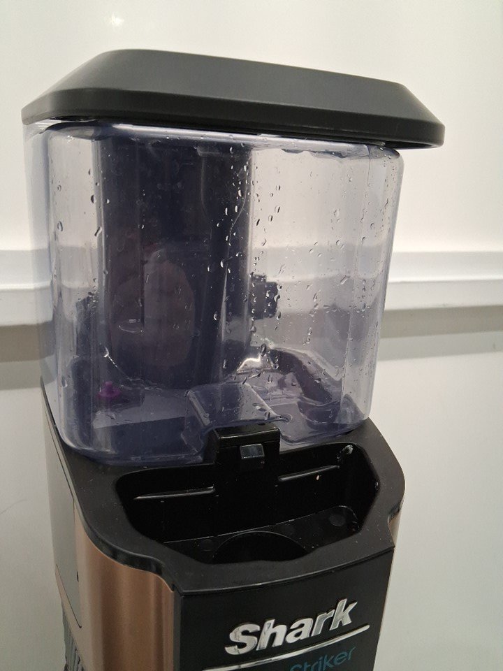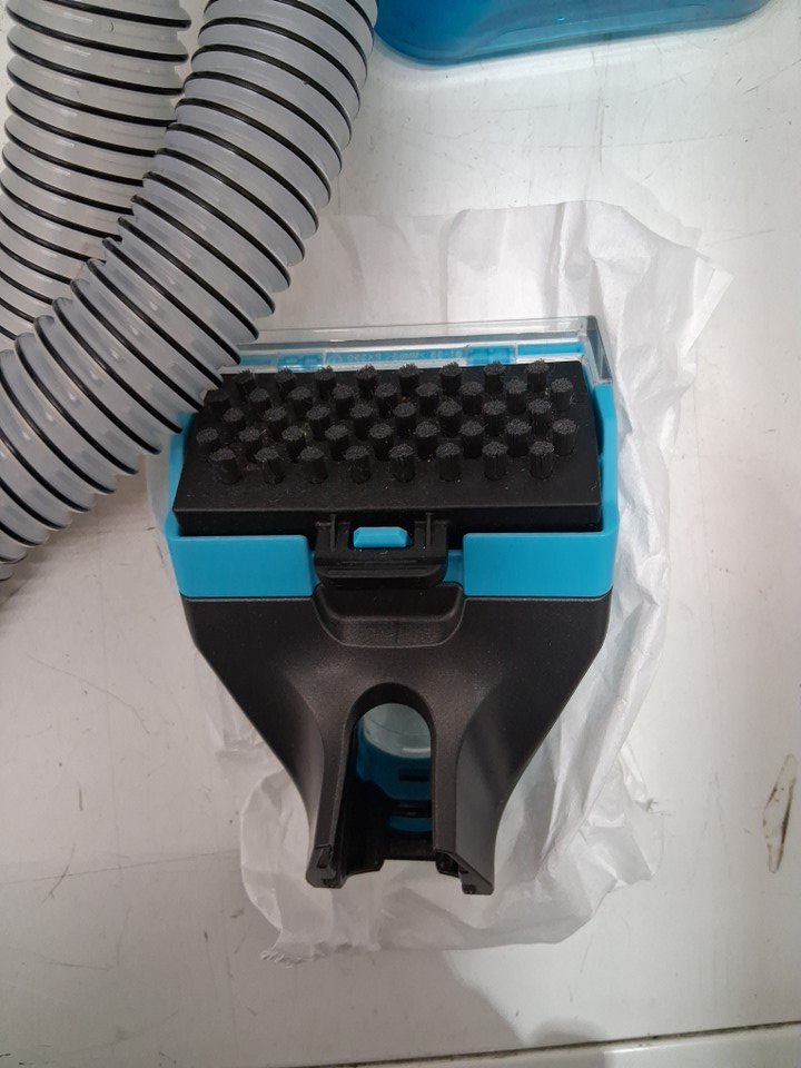 small trace of dirt/dust/chair in vacuum head and in bristles. some water can be seen in solution bottle.