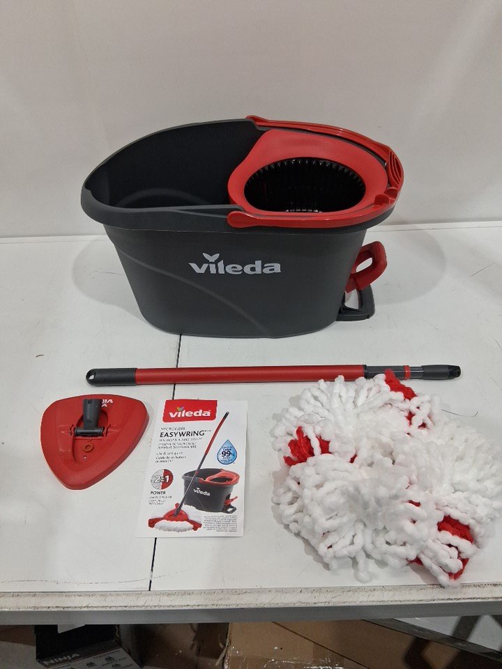 VILEDA EASYWRING POWER SPIN BUCKET SYSTEM WITH EXTENDABLE POLE and 2 mop heads- 22" - 48" - GREY/RED - (MODEL: 172880)