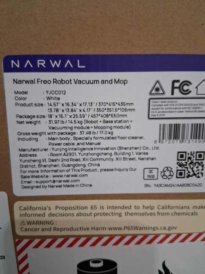 narwal freo 4-in-1 robot vacuum & mop combo, with washing & drying self empty base, dirt sense ultra clean, auto add cleaner & wifi/app control - white (model: yjcc012)