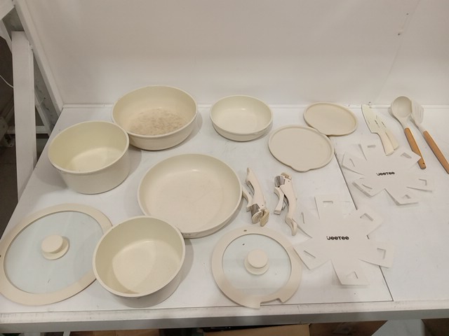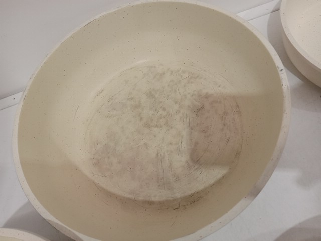 there is some staining and scratching on all of the pots. as well as some burn marks around the silicone lids. the knifes and spatulas have some wear to them.