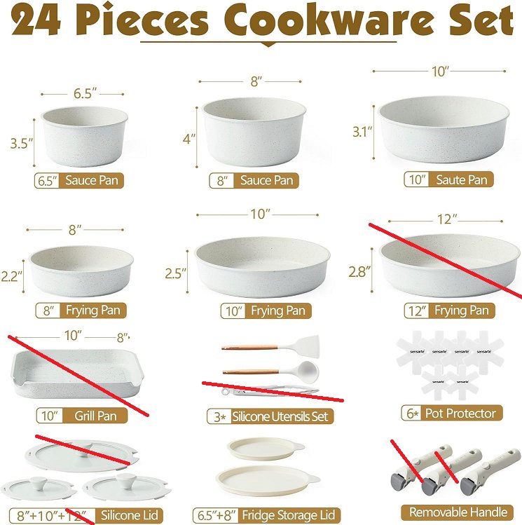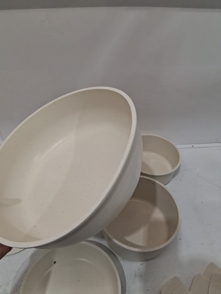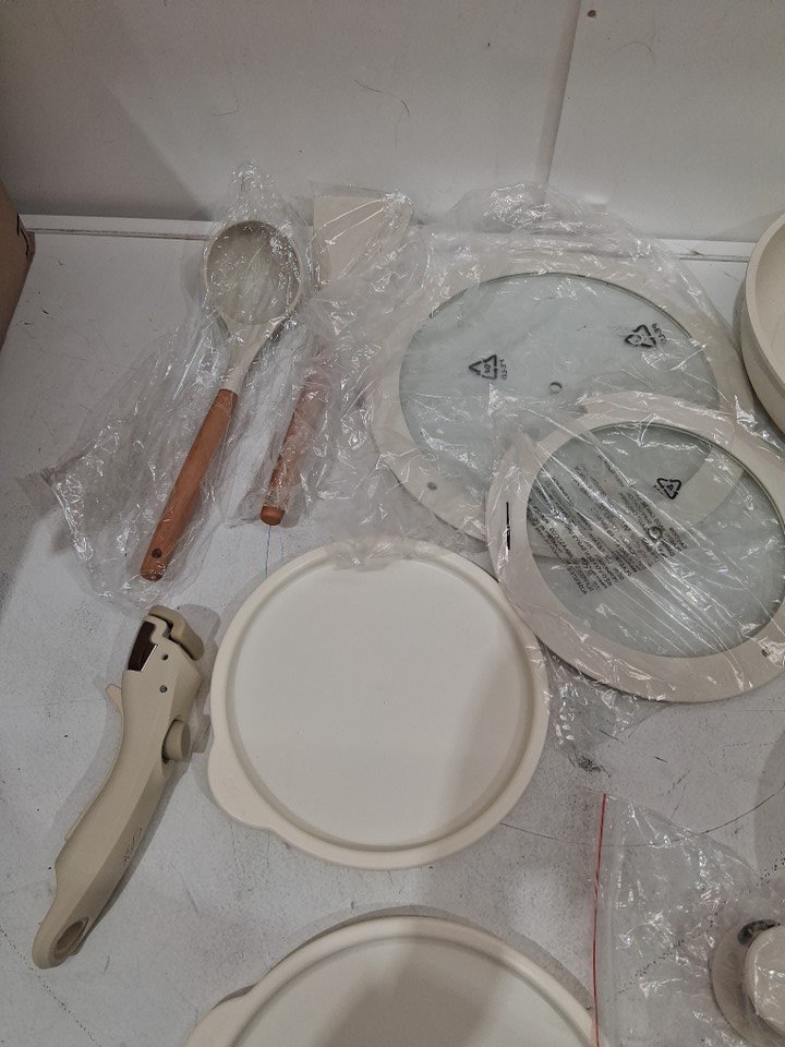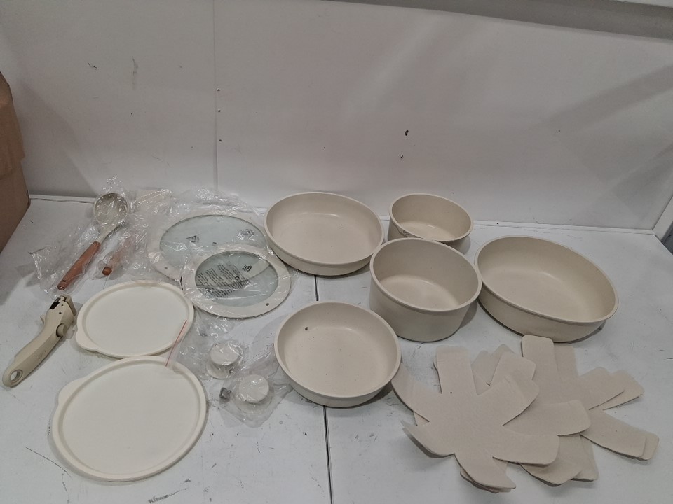 PLEASE SEE SECONDARY PHOTO FOR PACKING LIST (ITEMS WITH RED LINE ARE NOT INCLUDED) the 2 of the pans are lightly dented but still usable, there is a scuff/scratch in one of the smaller pans, only one handle