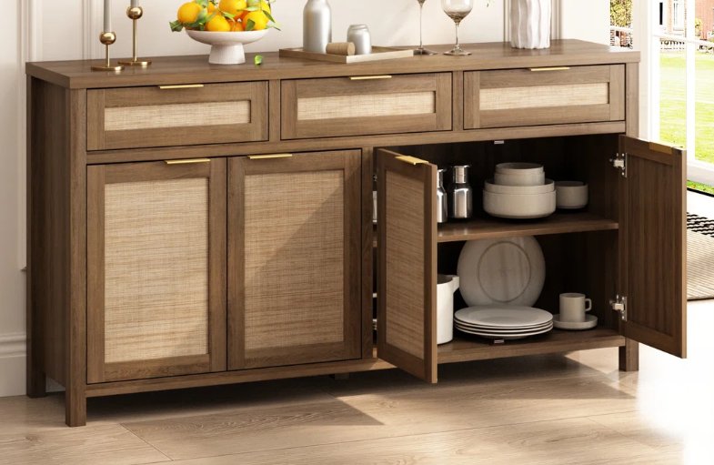 Ciauna Rattan Sideboard Accent Cabinet with 3 Storage Drawers Adjustable Shelf - 63'' - Medium Wood (model:PDBL6061)