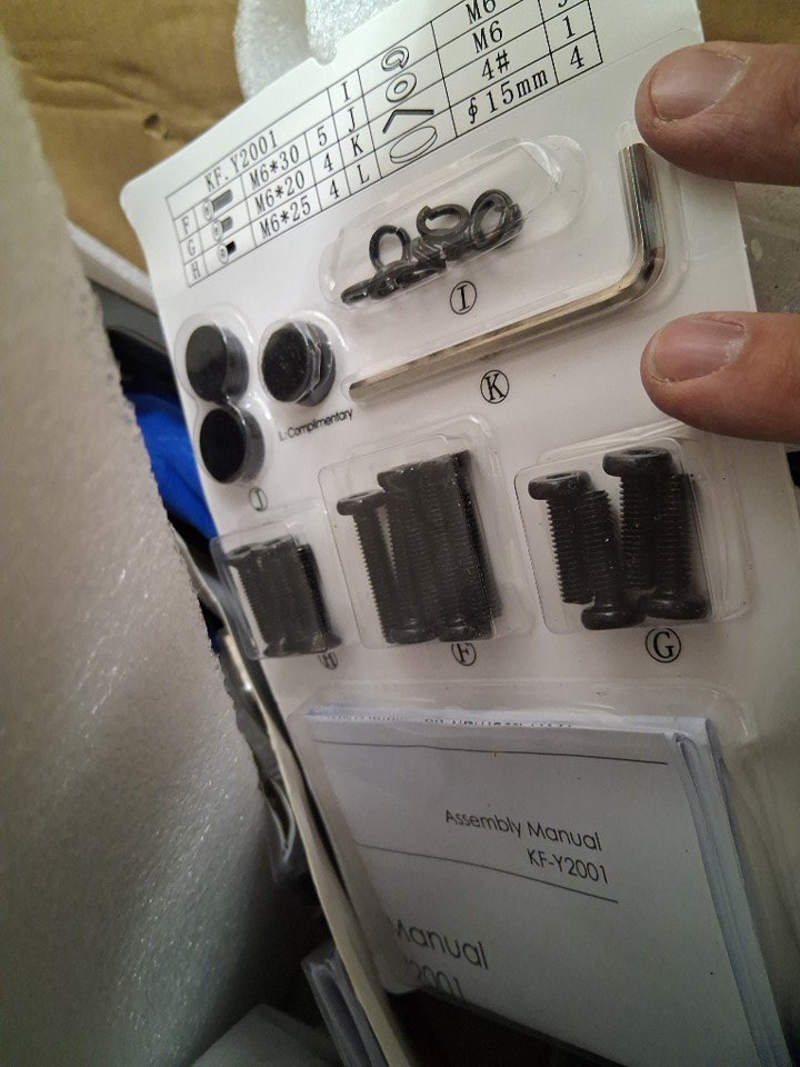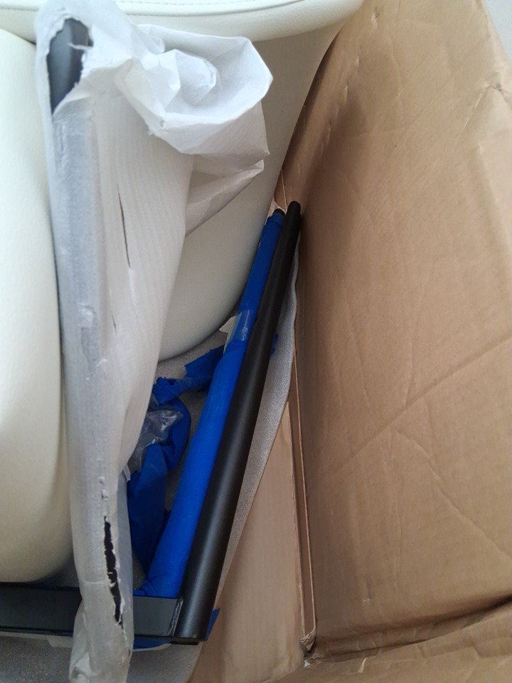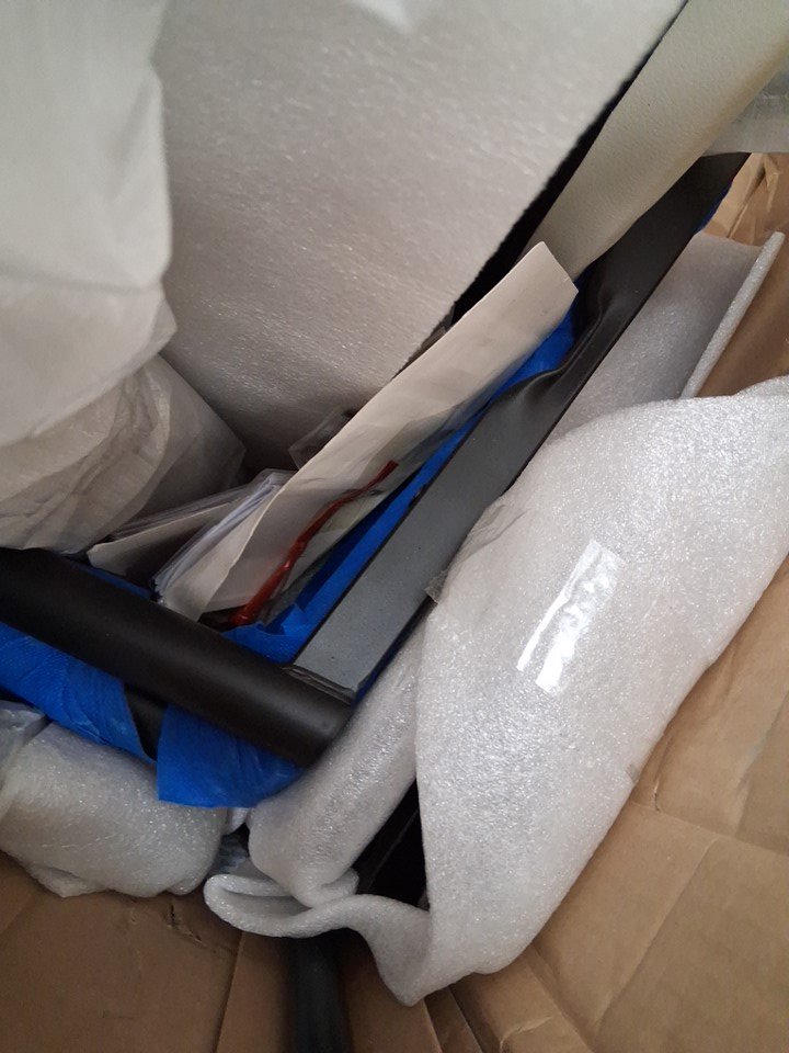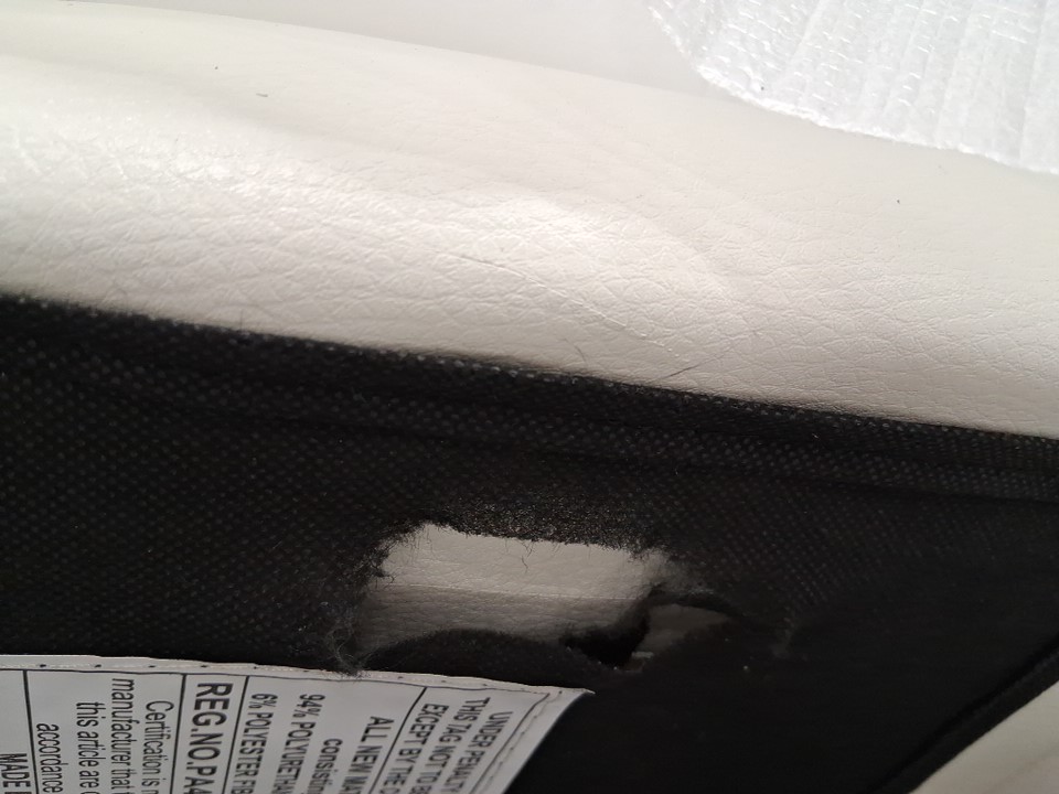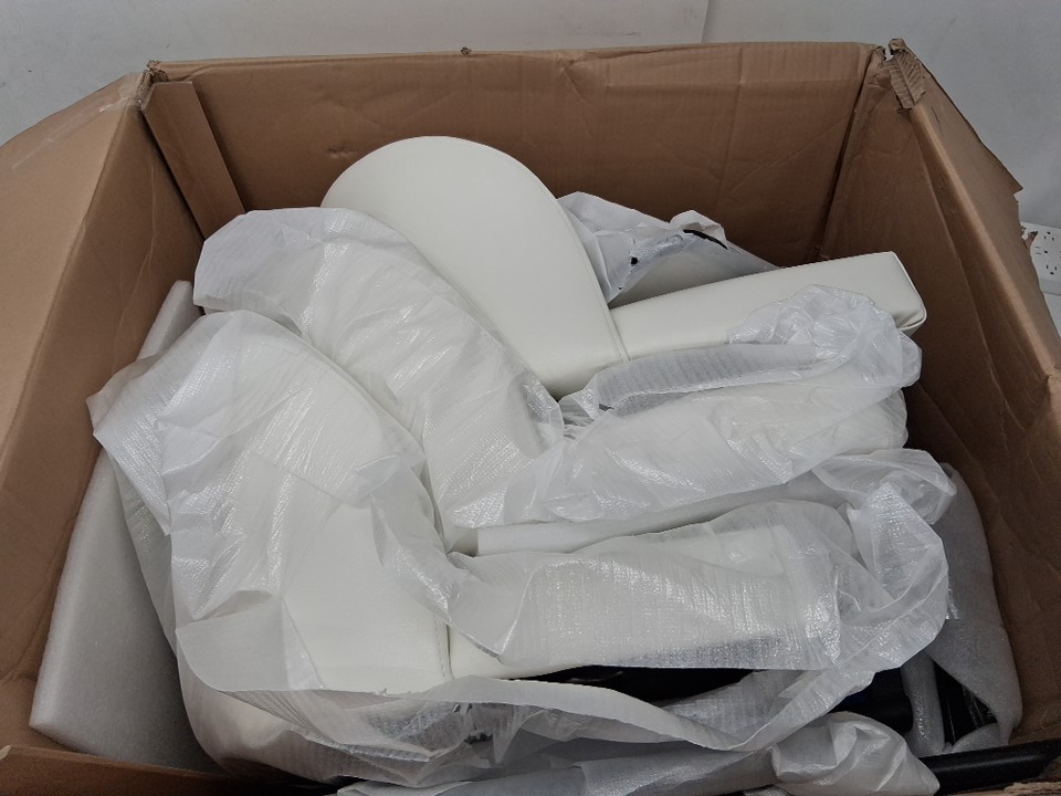 There is a small rip in the fabric on the bottom of one of the chairs, otherwise all parts appear present and in new condition - see photos. Customer may need to provide some extra hardware (screws, etc) in order to finish assembly.