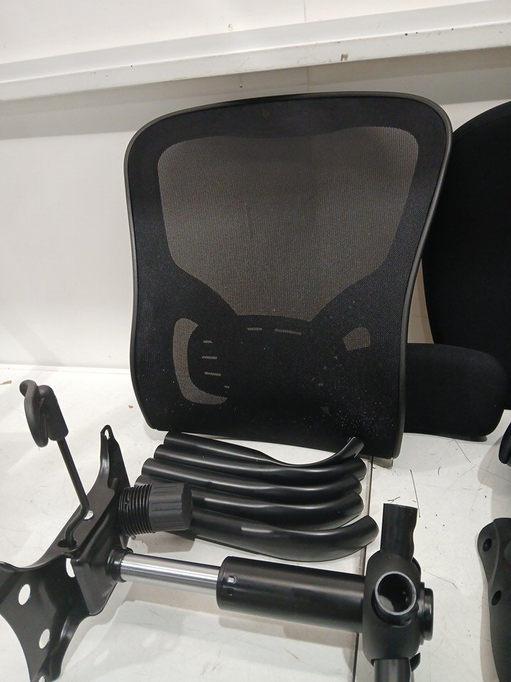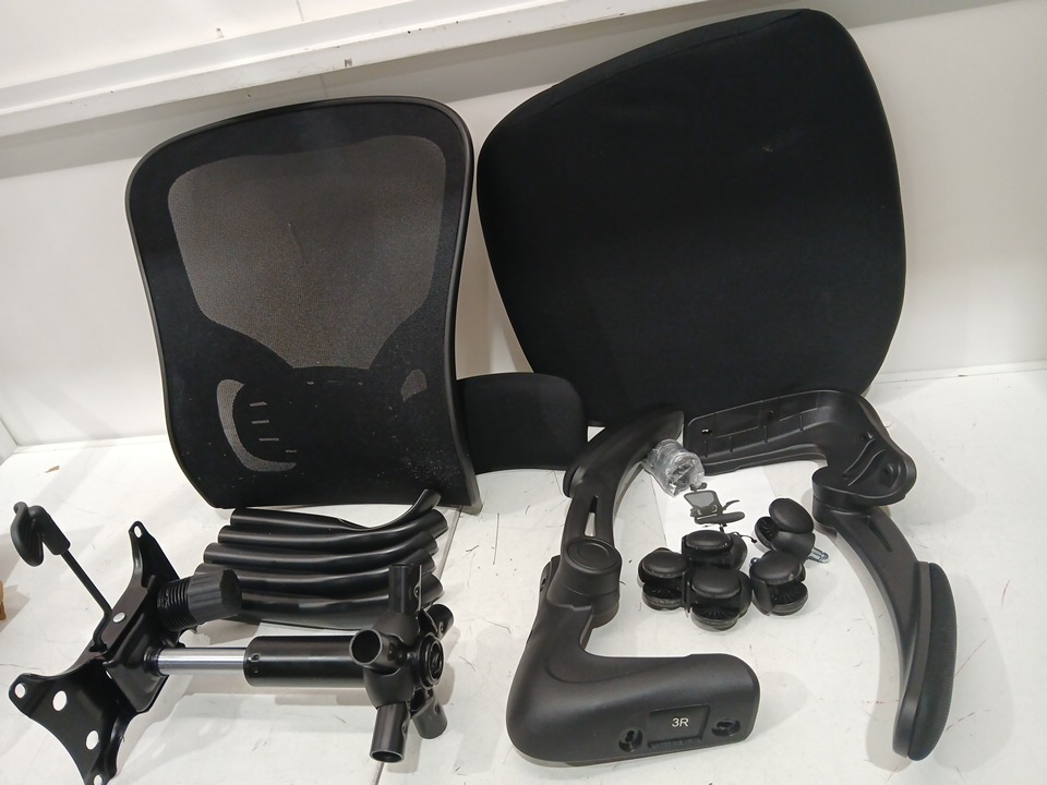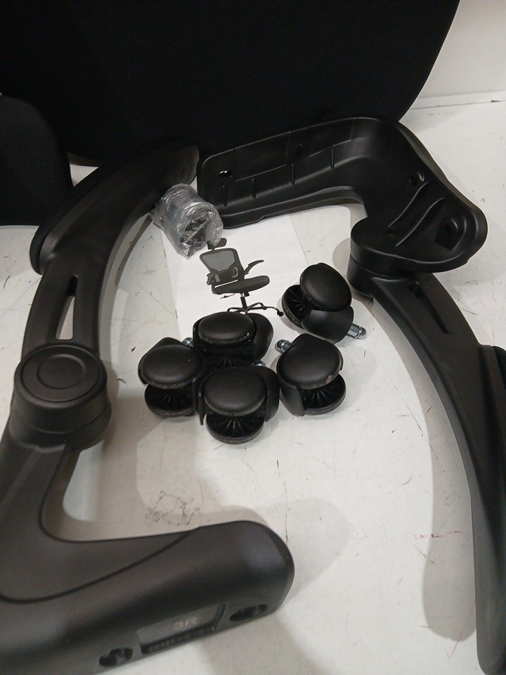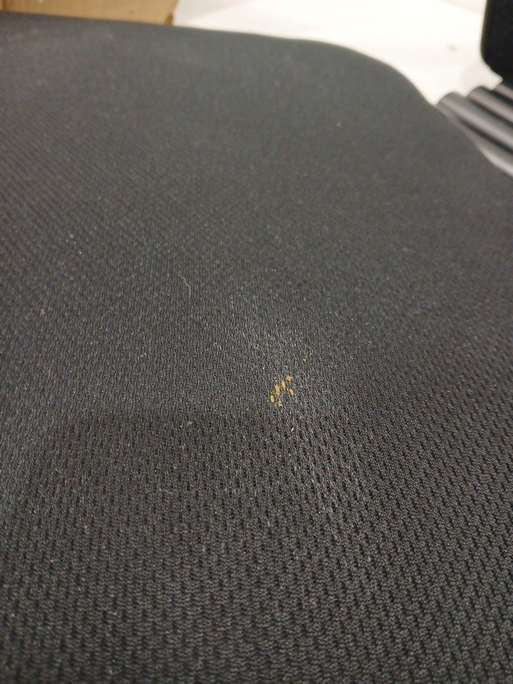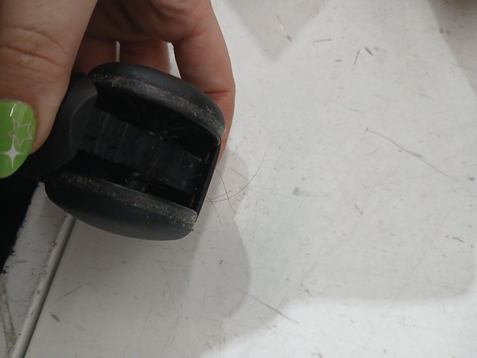 there is some dirt/debris and hair on the wheels there is a stain on the seat and there is some pilling/fuzz on the backrest