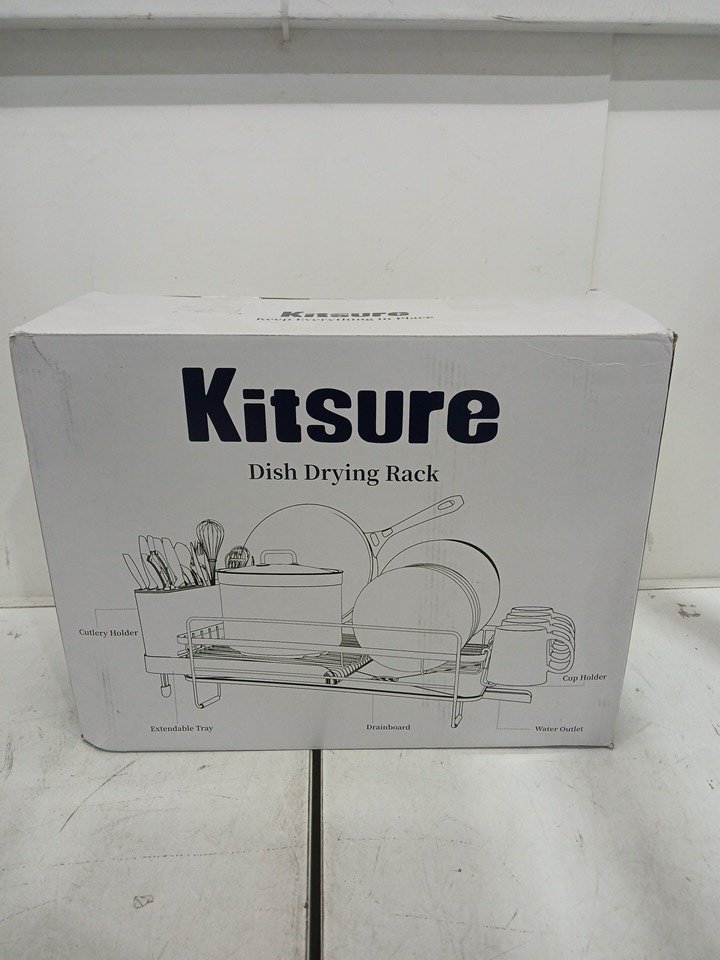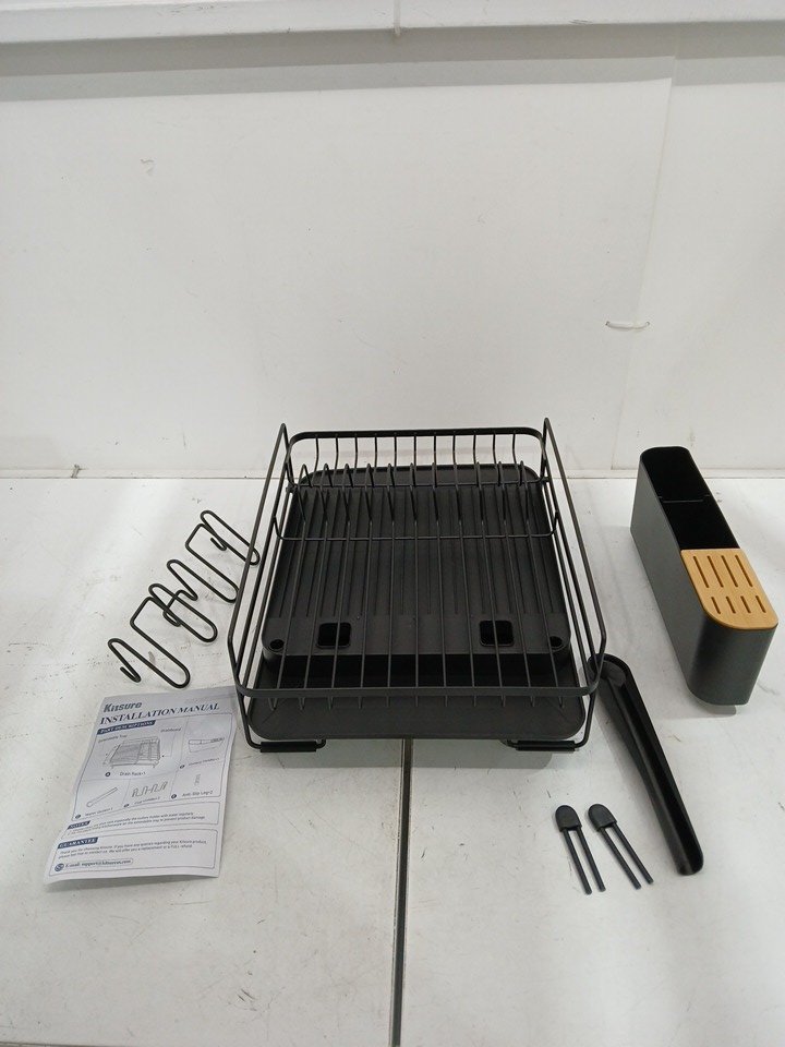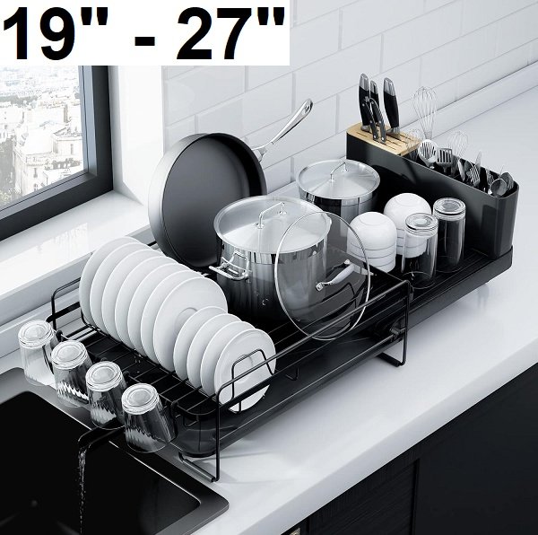kitsure anti-rust extendable dish drying rack with cutlery and cup holders - 19" to 27" - black (model: ‎463)