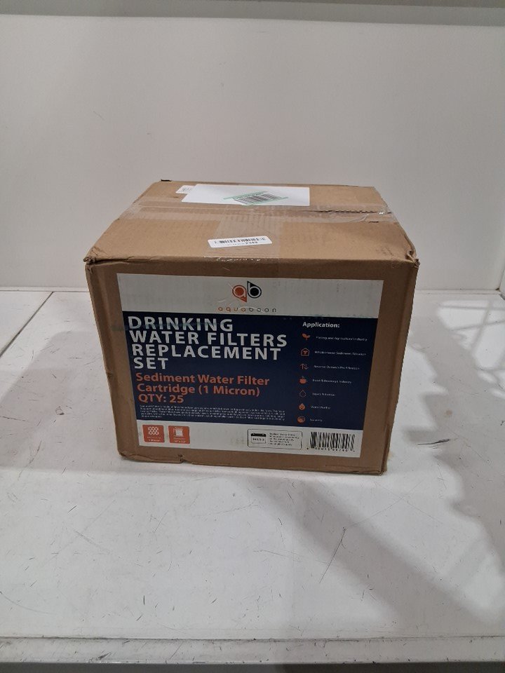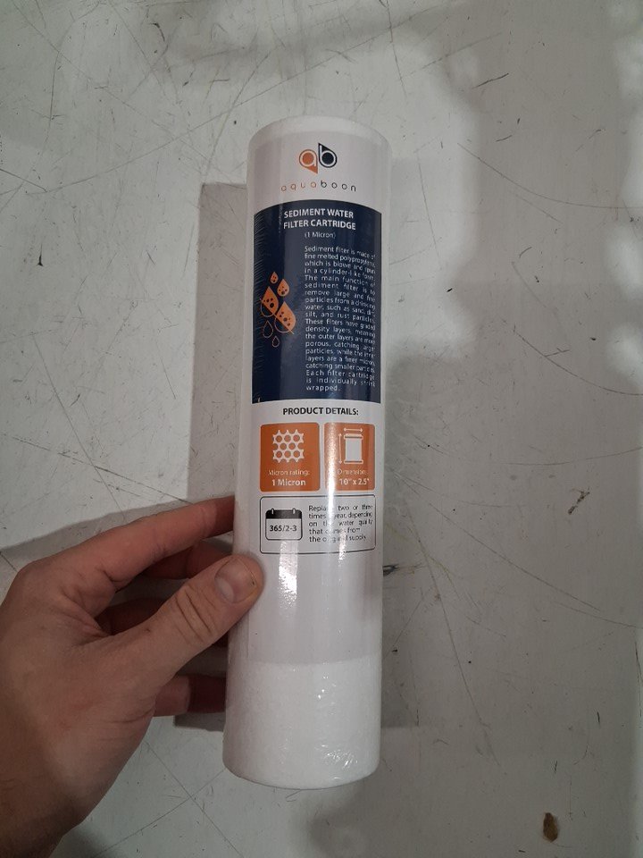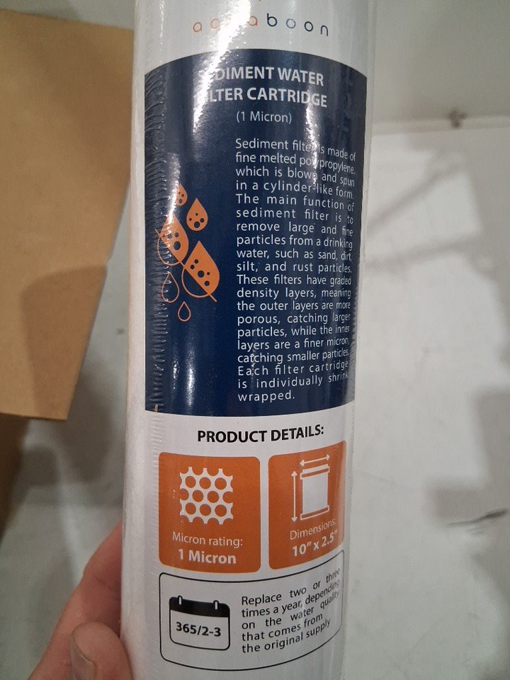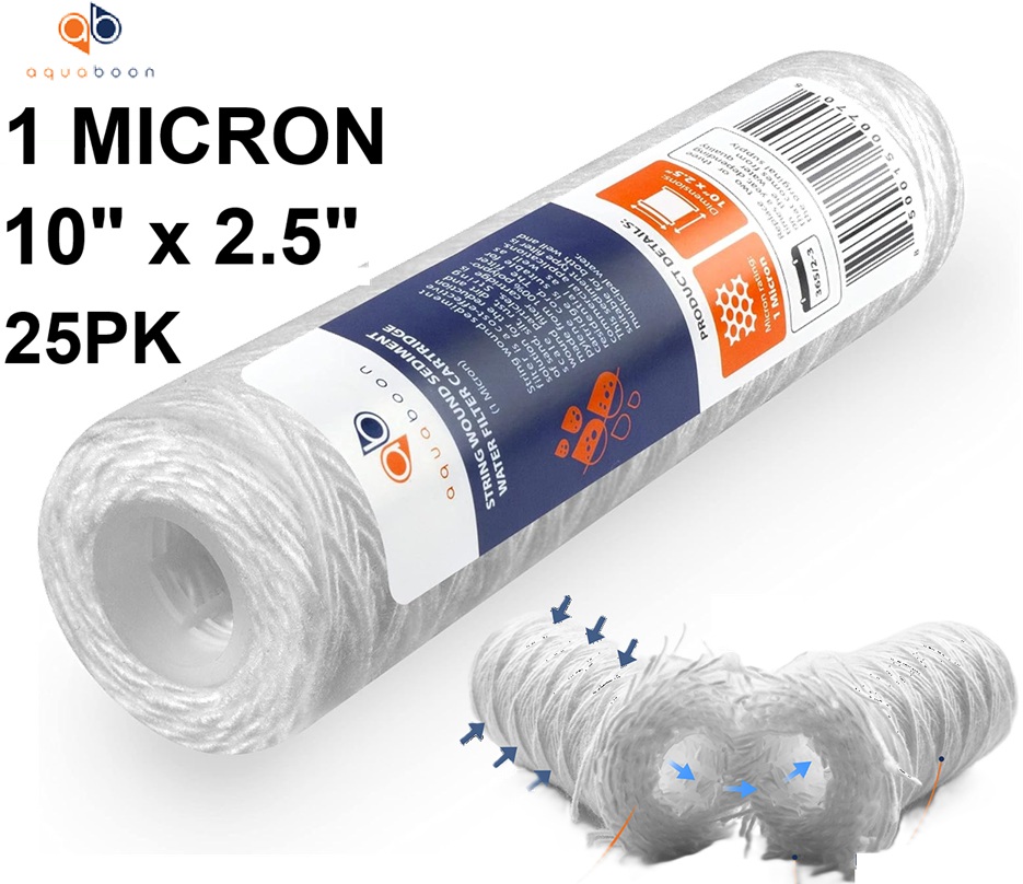 25PK Aquaboon String Wound Sediment Water Filter Cartridge Replacement Reduces Sediment Removes Odor - 1 micron - 10" x 2.5" - white - (model: ABC-25SW1M)