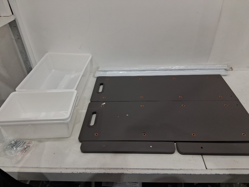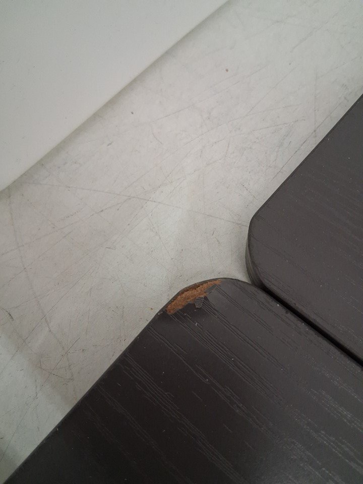 missing bins, only has 3. can be replaced. small chip in the corner of the wood piece