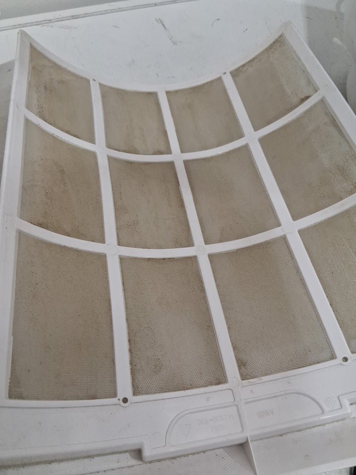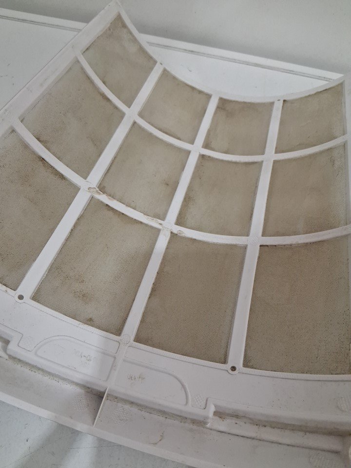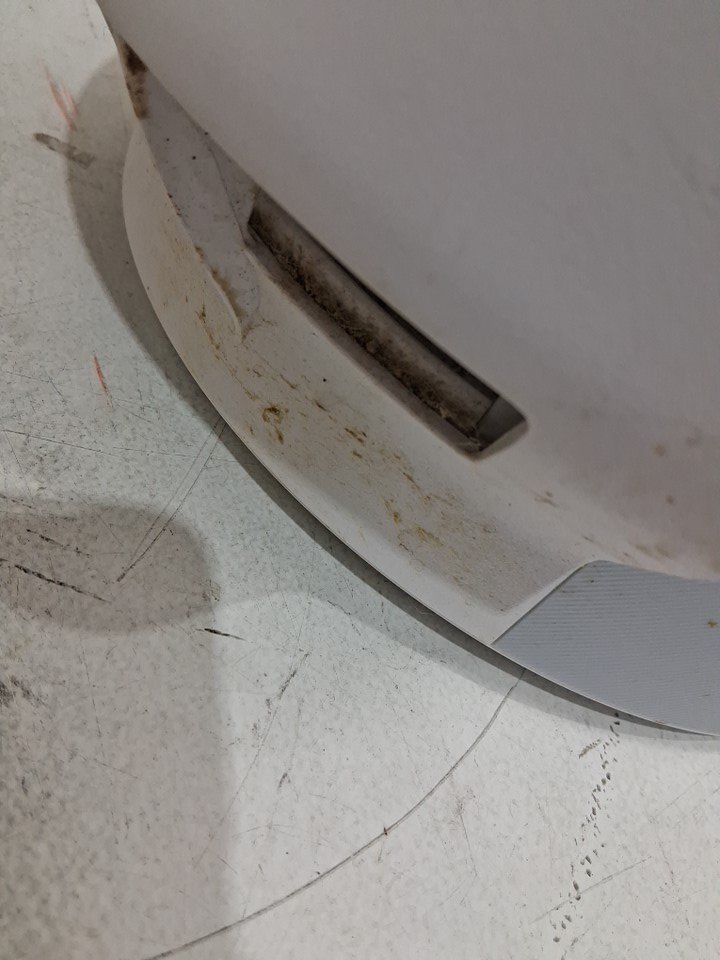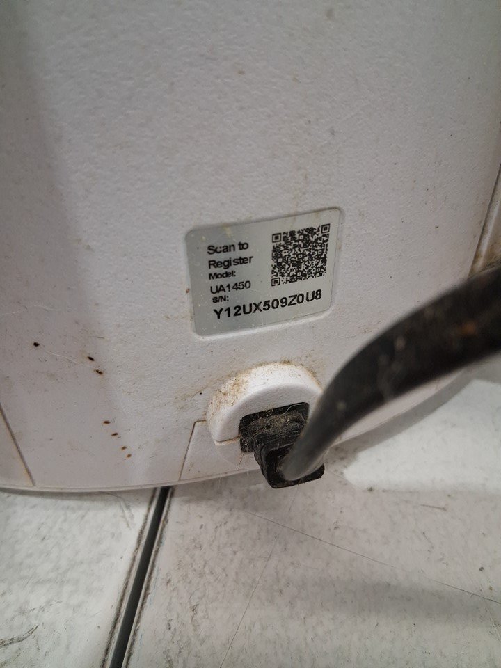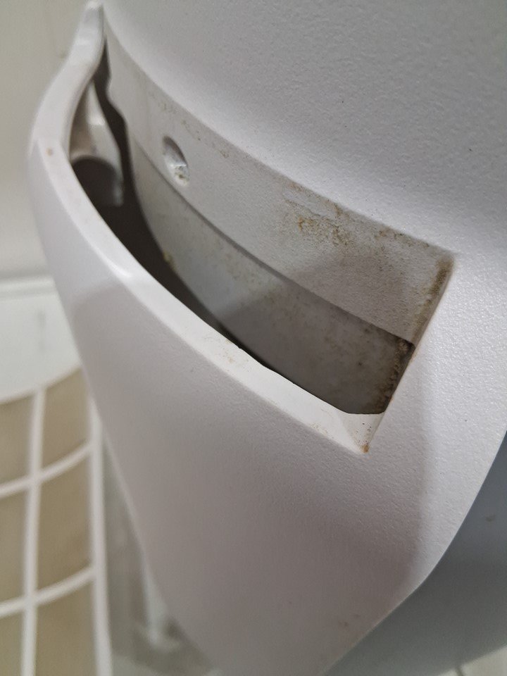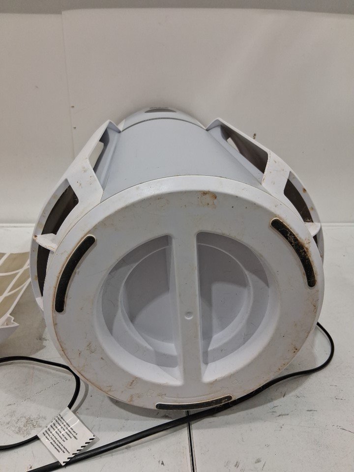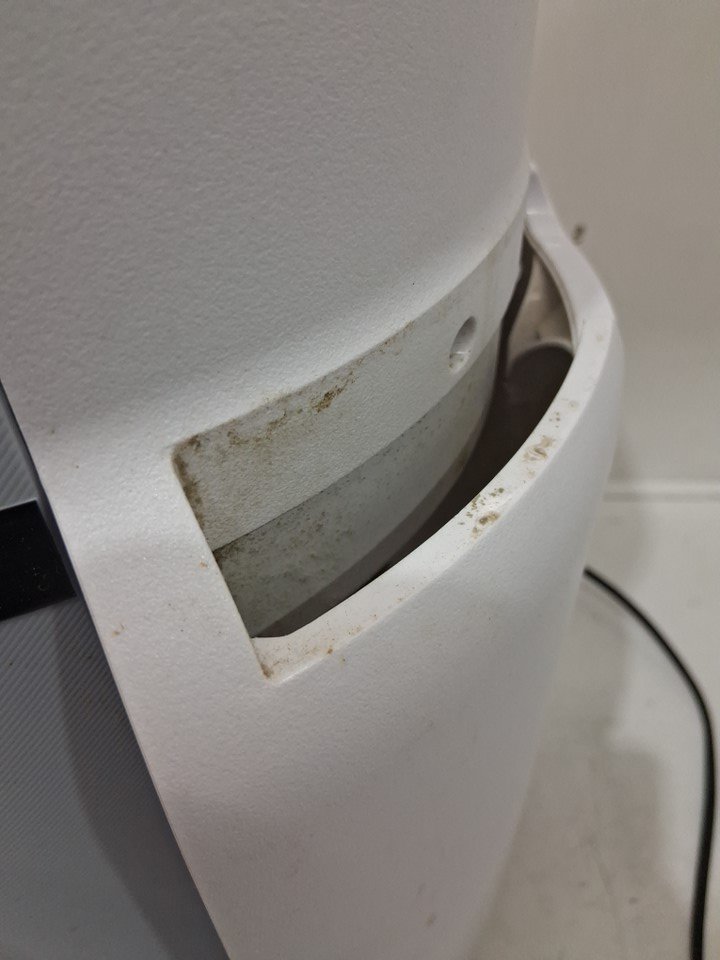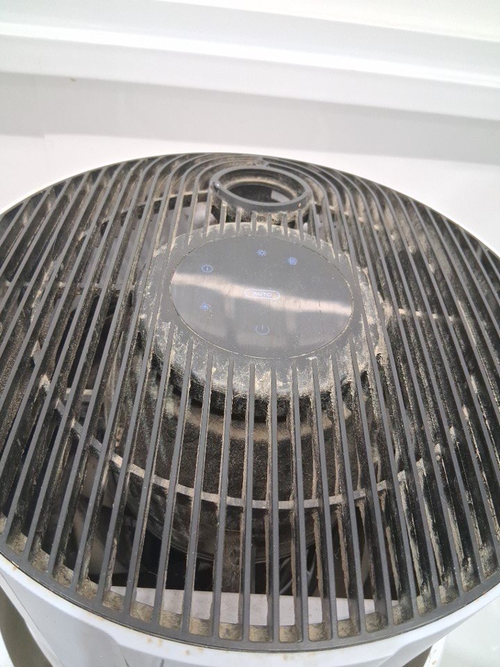 this item has heavy dust/dirt residue as well as splatters, no noticeable odour, the filters will need cleaning or replacing, the whole item will need a good cleaning, the item was tested for power and found to be functional, the item is also missing the optional scent attachment