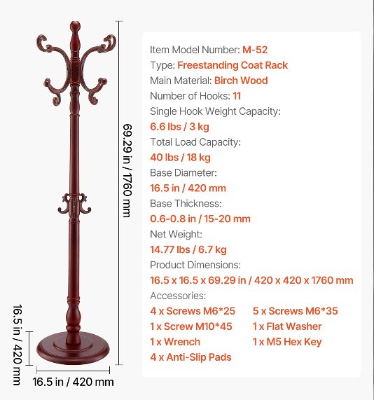 VEVOR Coat Rack Freestanding Wooden Coats Rack Stand with Weighted Base and 11 hooks - red/brown (model:M-52)