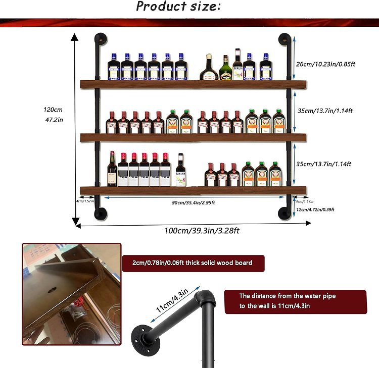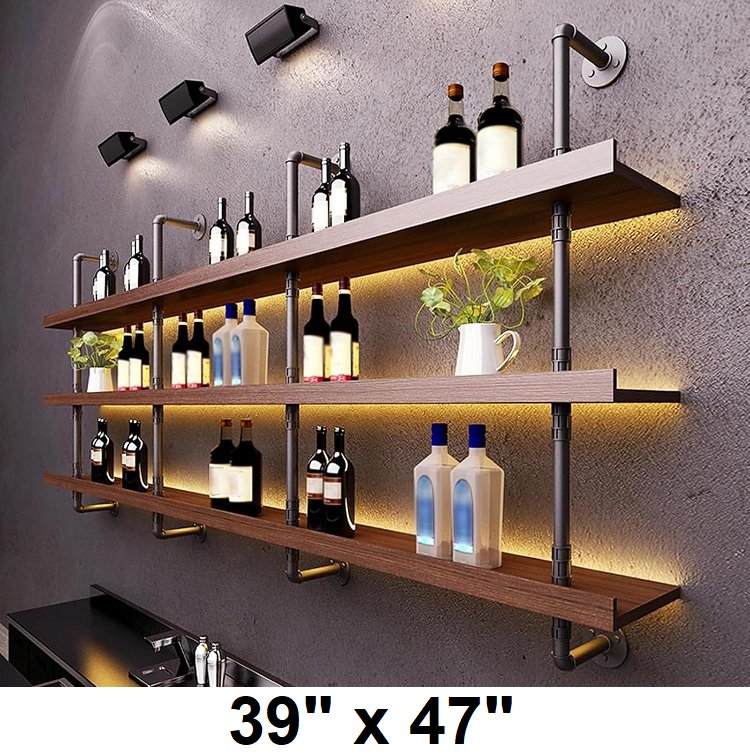 wall-mounted 3-tier industrial liquor shelf with led lights - walnut/black