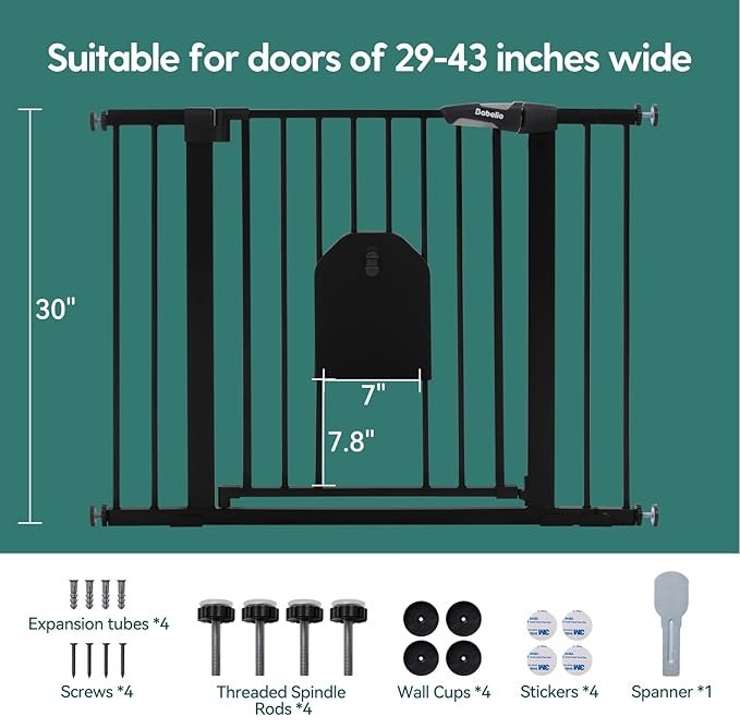 babelio extra tall pressure mounted metal child safety gate with pet door - 29" to 43" x 30" - black
