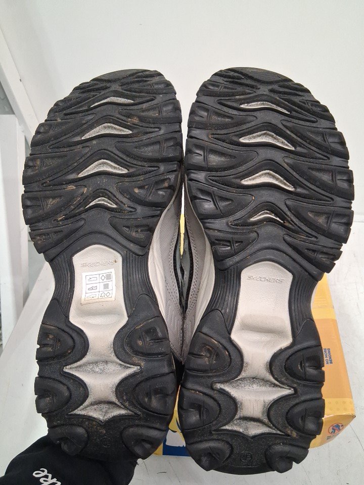 The bottoms of both shoes have dirt on them from previous use.