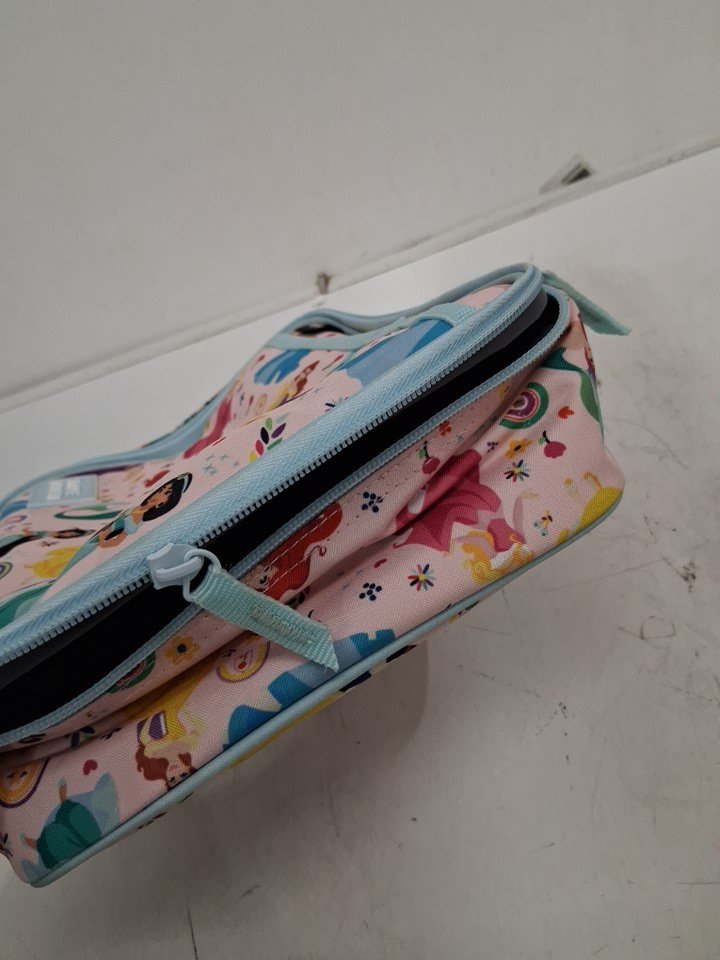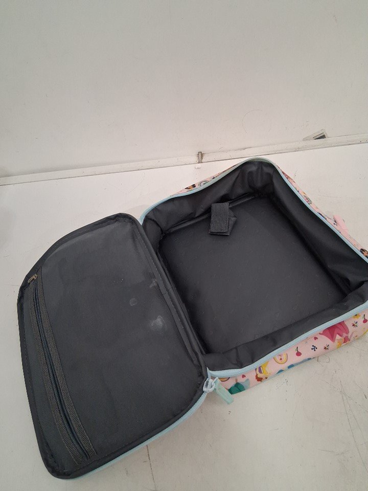 item has some very minor food residue inside from previous use also one of the zipper is off but it still closes with one zipper