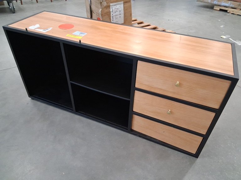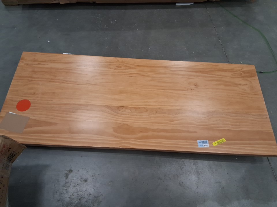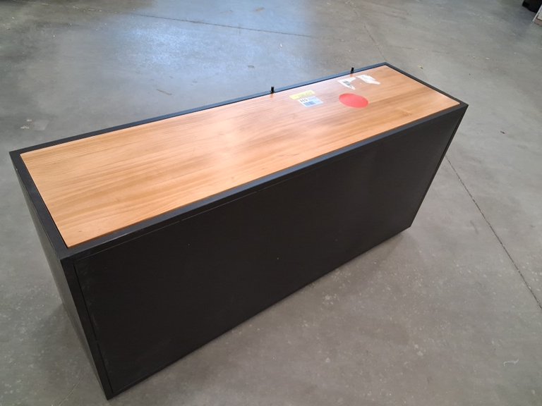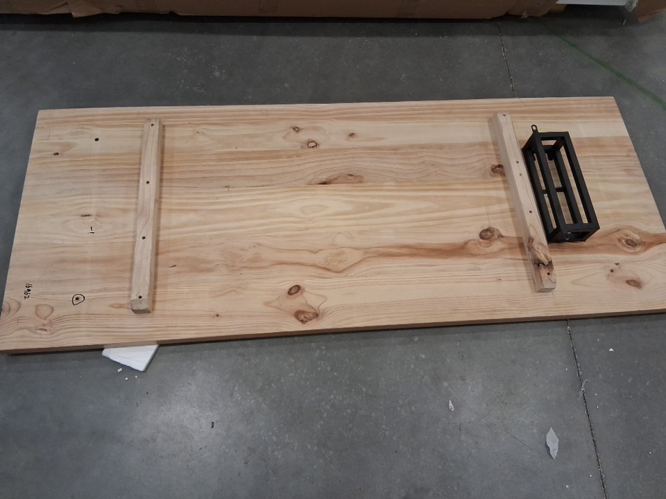 only including table top and the right side piece, oak piece with 4 shelves for underneath left side of tabletop is not included 3 of the legs are warped and one is missing, side of cabinet is bent inwards however will not affect usage of product