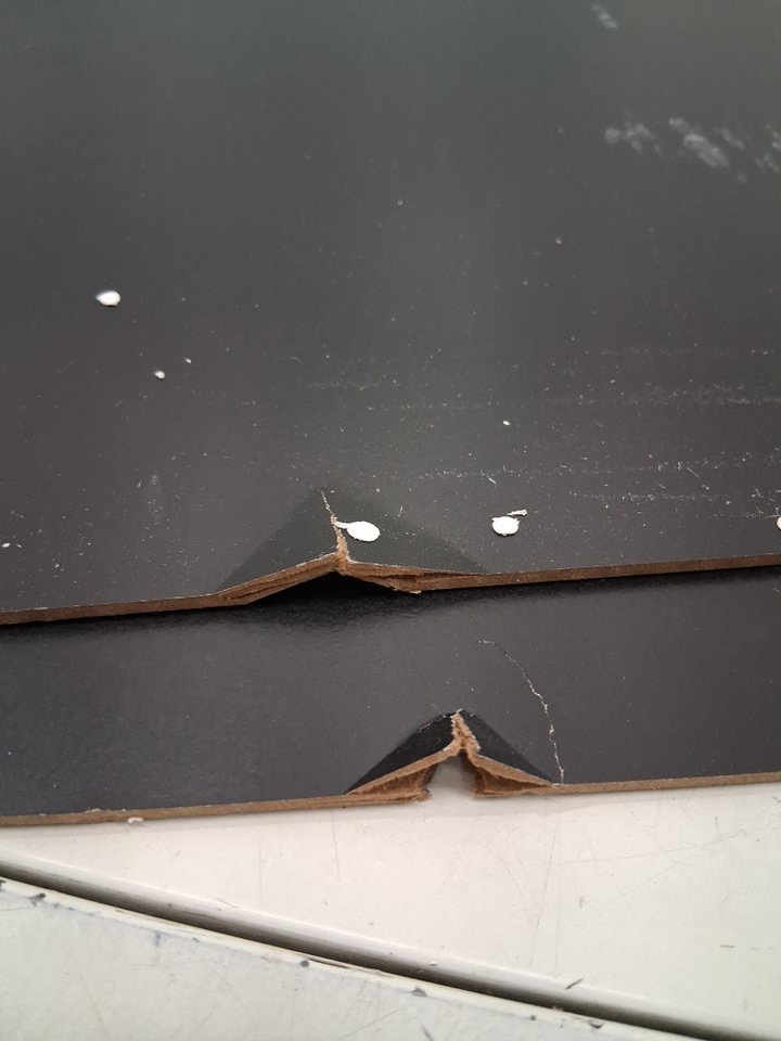 item has signs of previous use, there is two areas of distress in the two boards that sit inside the cabinet. please see photos