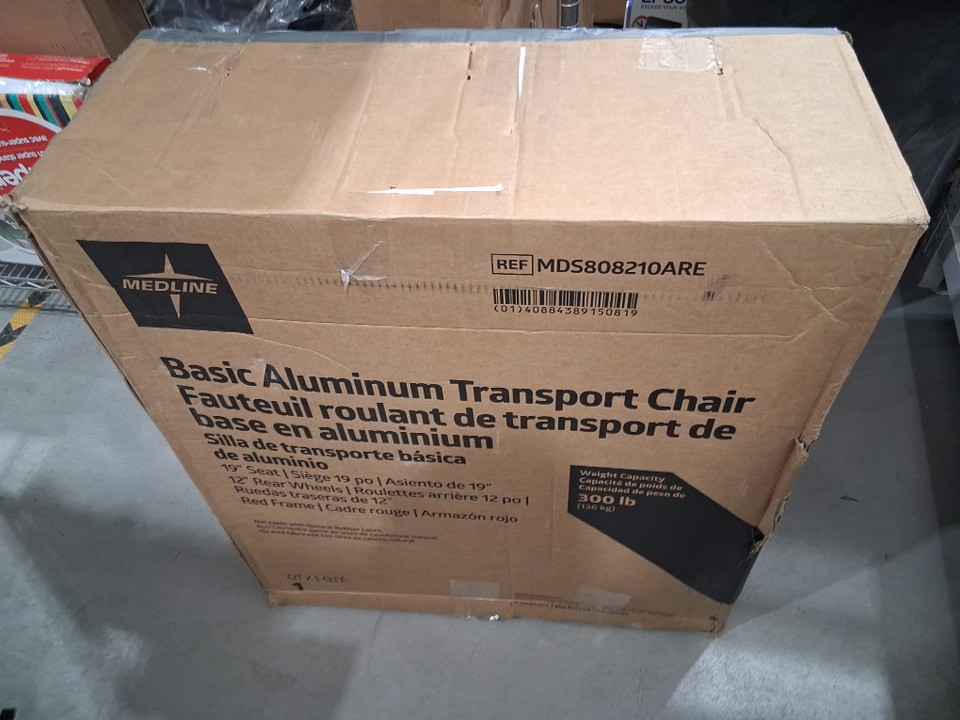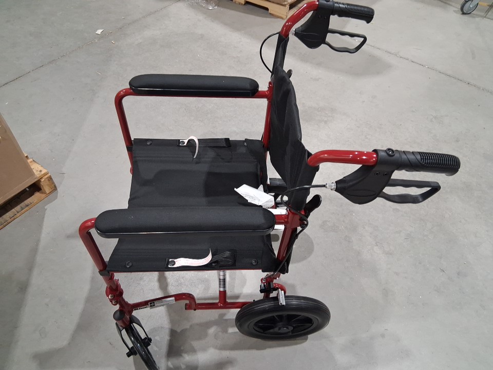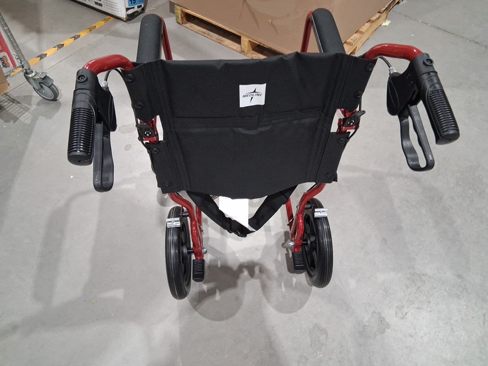 MEDLINE BASIC ALUMINUM TRANSPORT WHEELCHAIR - 19" - 12" REAR WHEELS WITH BRAKES - 300lbs capacity - RED (MODEL: MDS808210ARE)