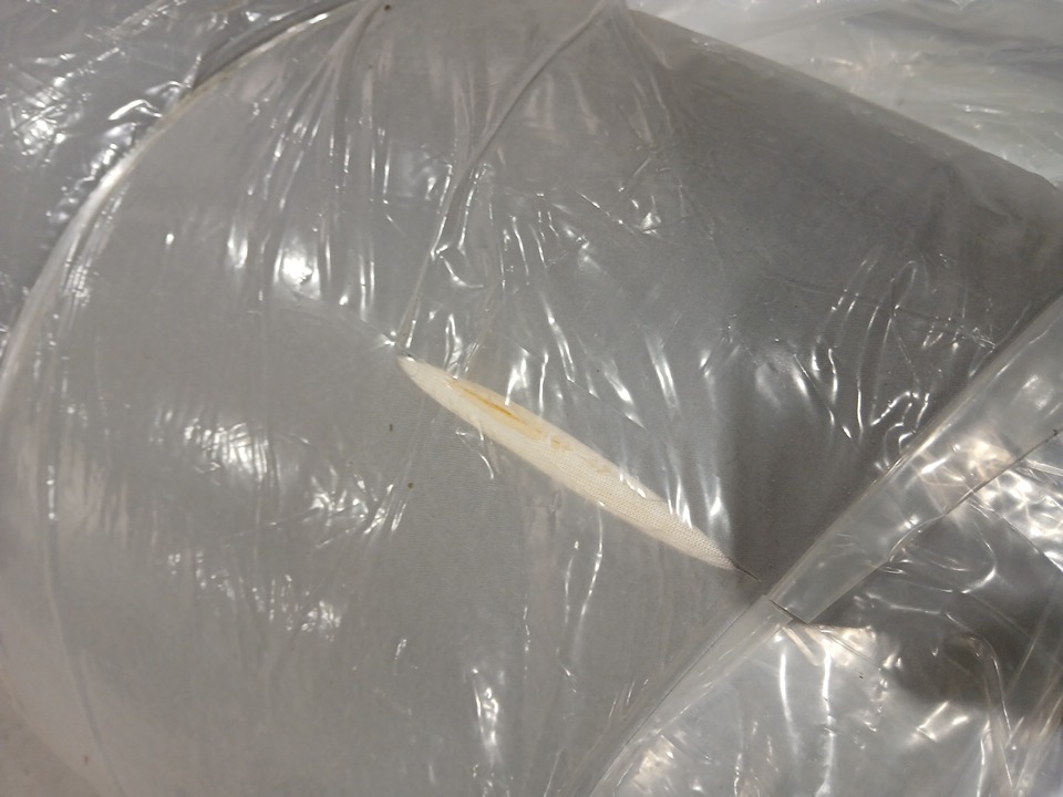 Please note there is a minor presence of dirt/debris, indicating prior use, as well as a light slice in the material on the bottom side. See photos attached.