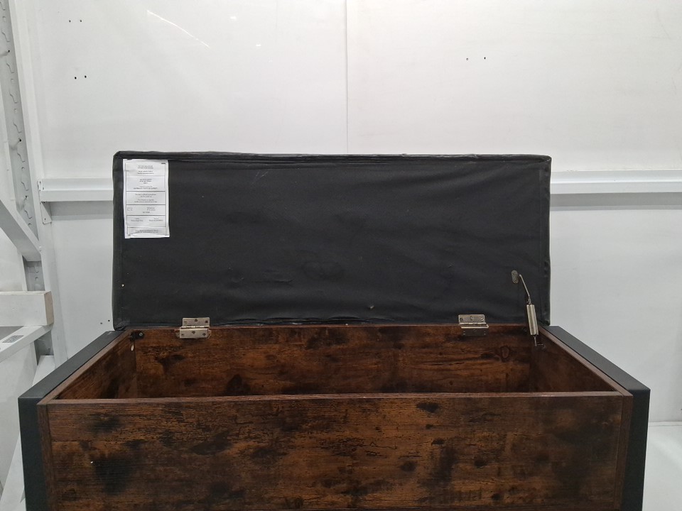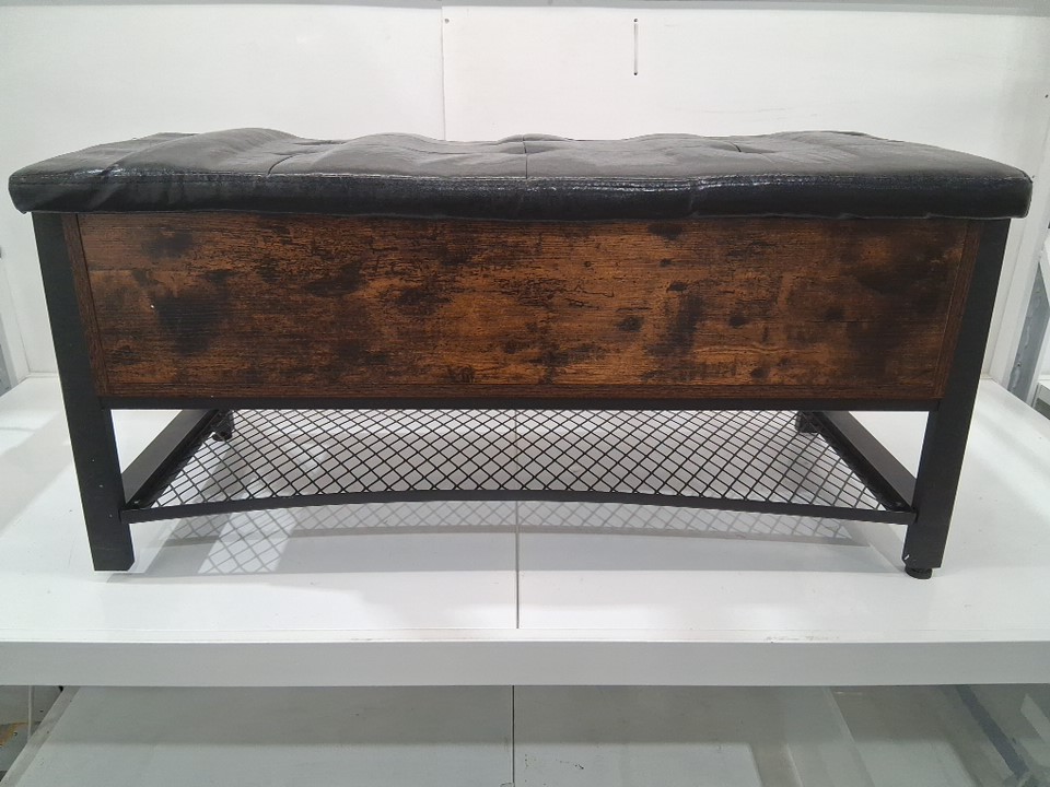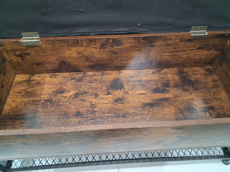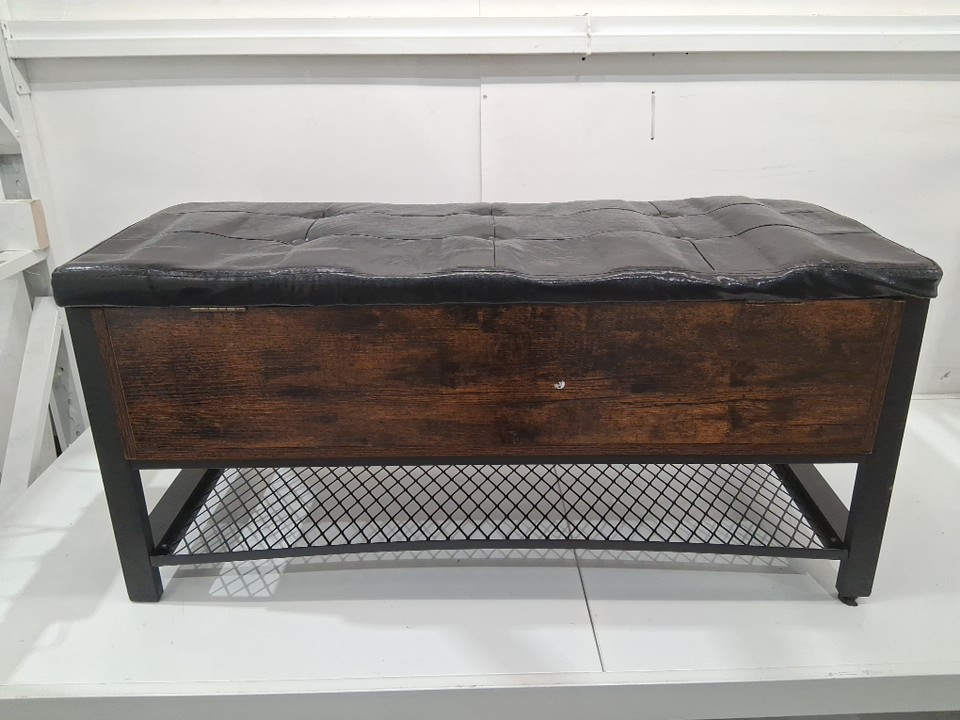 Due to shipping without packaging, one of the hinges of the seat has ripped out of place, the bottom shelf is slightly bent out of shape, and 2 feet are missing while another is cracked - see photos. Outside of these issues, does not show any obvious signs of being previously owned or used.