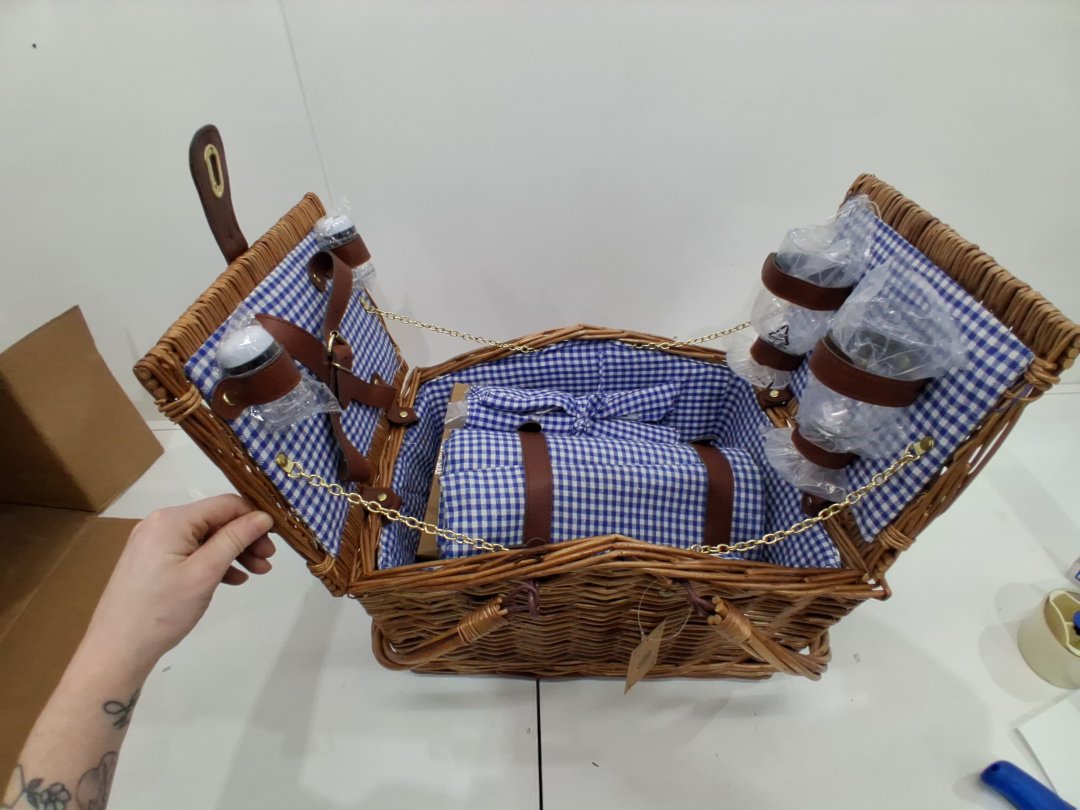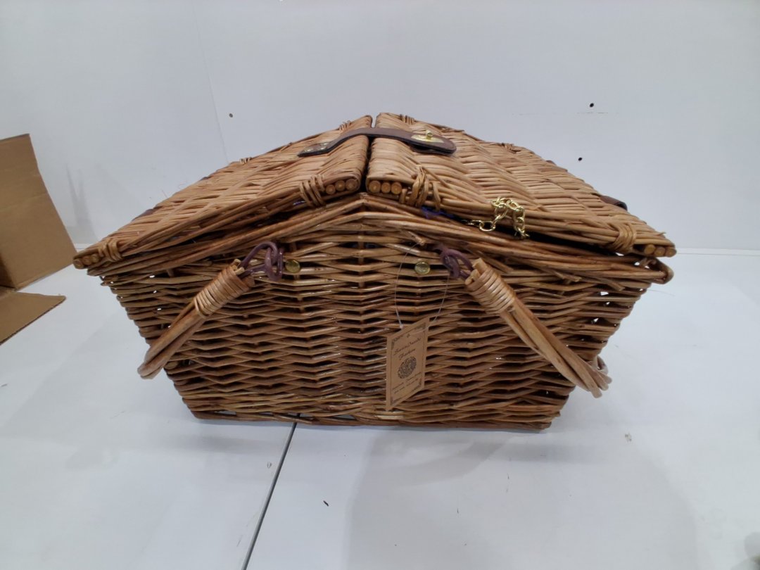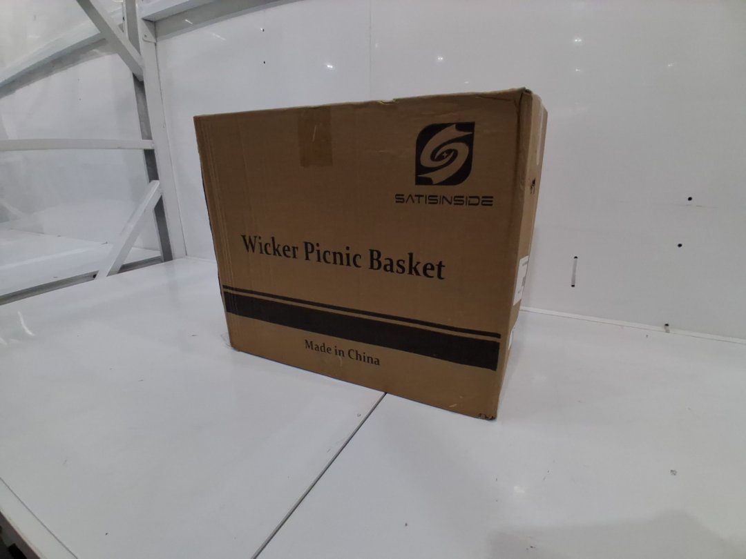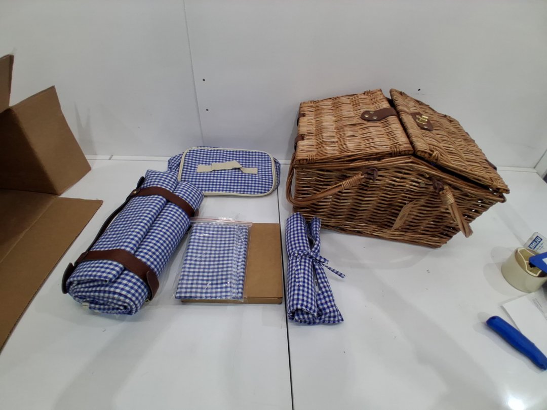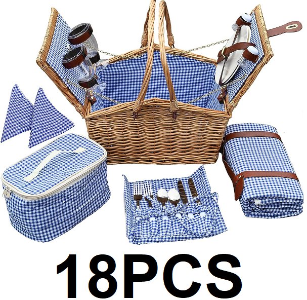 18PC SATISINSIDE WICKER PICNIC BASKET FOR 2, COMPLETE SET WITH COOLER HAMPER AND PICNIC BLANKET, BLUE GINGHAM DESIGN/WICKER, (MODEL: ‎SX-LanGe-Sais)