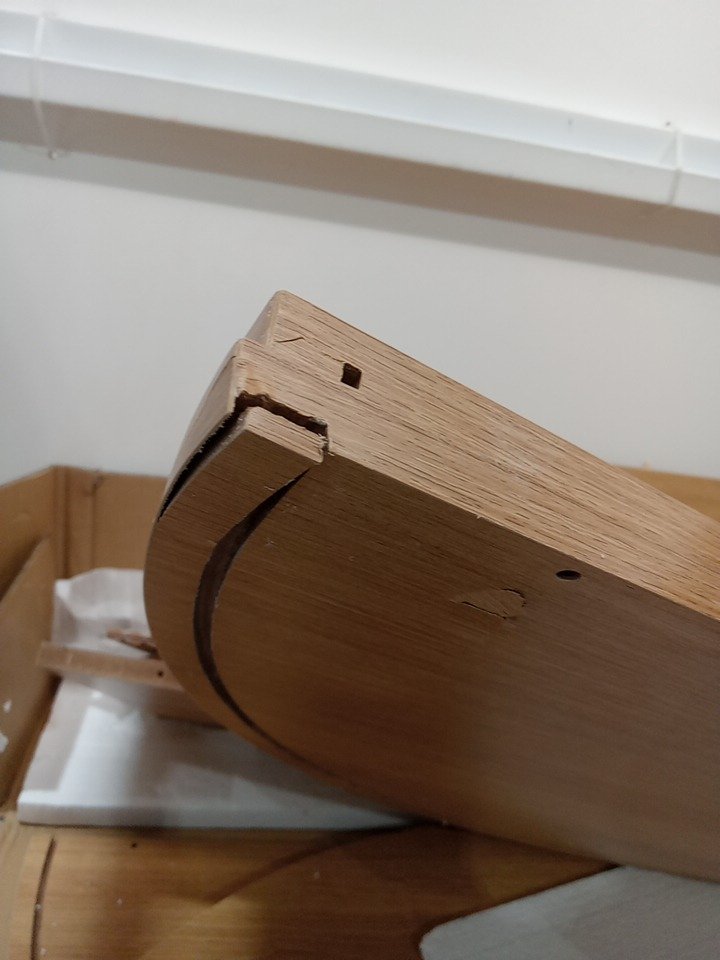 One of the pieces is cracked, unsure if wood glue can fix it. The dowels are still in most of the pieces. Ours does not lift up.