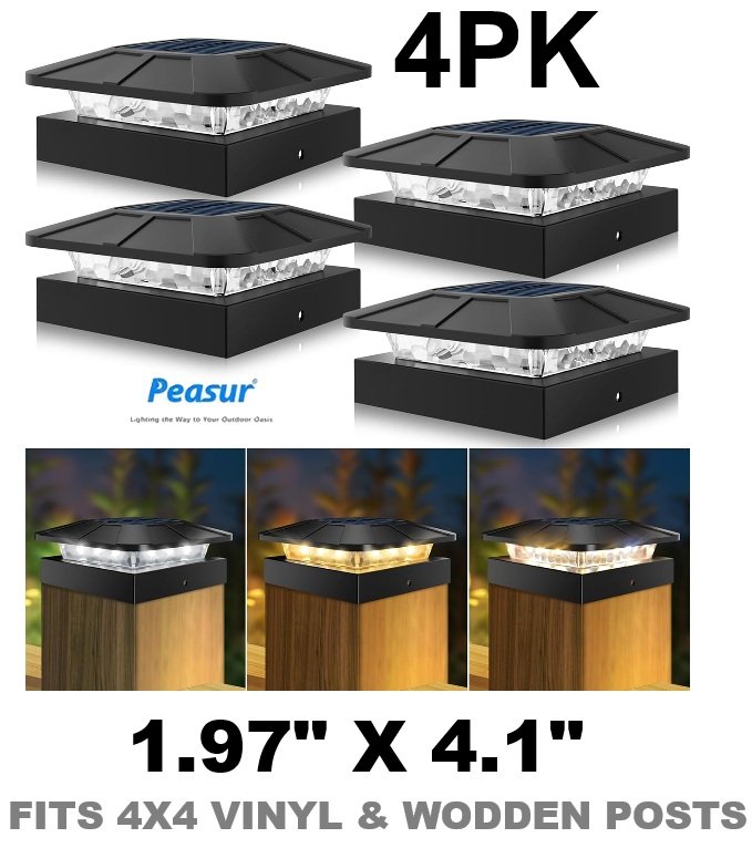 4PK ‎Peasur Outdoor Solar Post Caps Lights, fits 4" x 4" vinyl & wooden posts with 3 Color Modes & 2 Brightness Options-black
