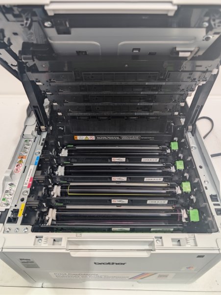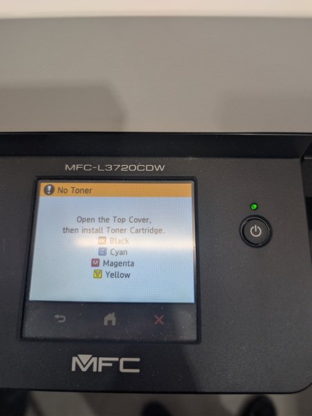 Item shows signs of being previously used prior to being returned. Item marked with having issue as a top tab (for paper to slide out onto has been broken off). Also since there are no toner cartridges installed/present in the printer we are unable to test the full functionality of the printer. Just for power/basic functionality. See attached photos.