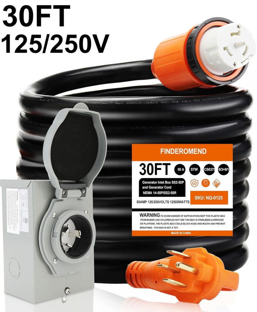 finderomend Generator Cord and Power Inlet Box Combo Kit - 30ft - 125/250 Volts - 50 Amp (Model: ED-502P)