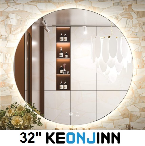 KEONJINN ROUND LED BACKLIT MIRROR - ROUND BATHROOM VANITY MIRROR WITH LIGHTS AND TOUCH BUTTONS - 32" - (MODEL: JZR80)