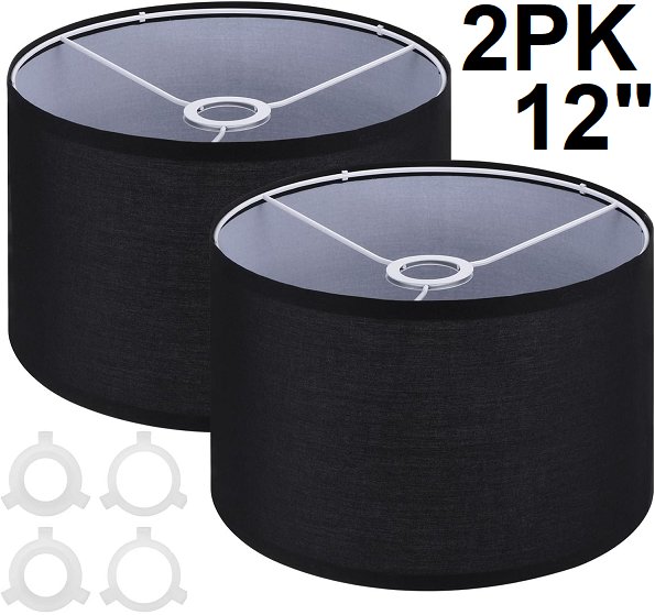 2PK easy assembly drum lamp shades with e27/e26/e14 adaptors - 12" round x 8" height - black