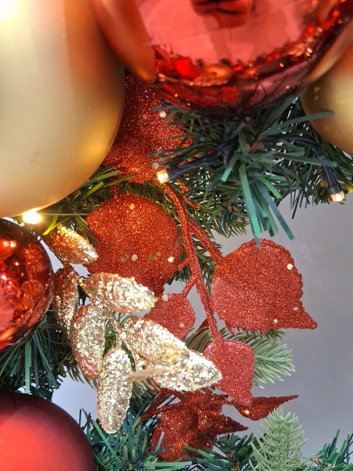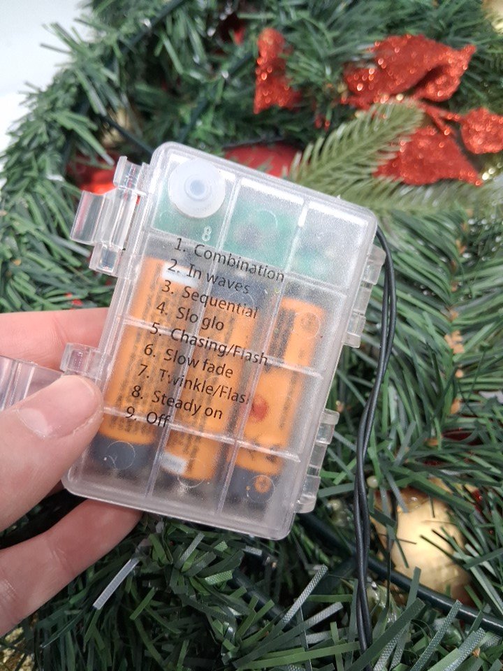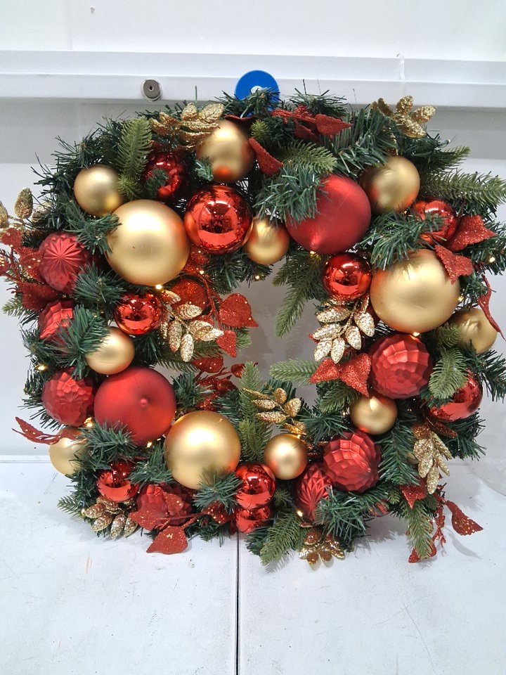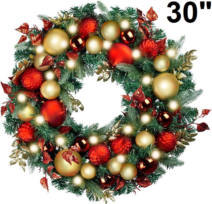 wanna-cul pre-lit decorated christmas wreath - 9 light functions - 30" round - green / gold/ red