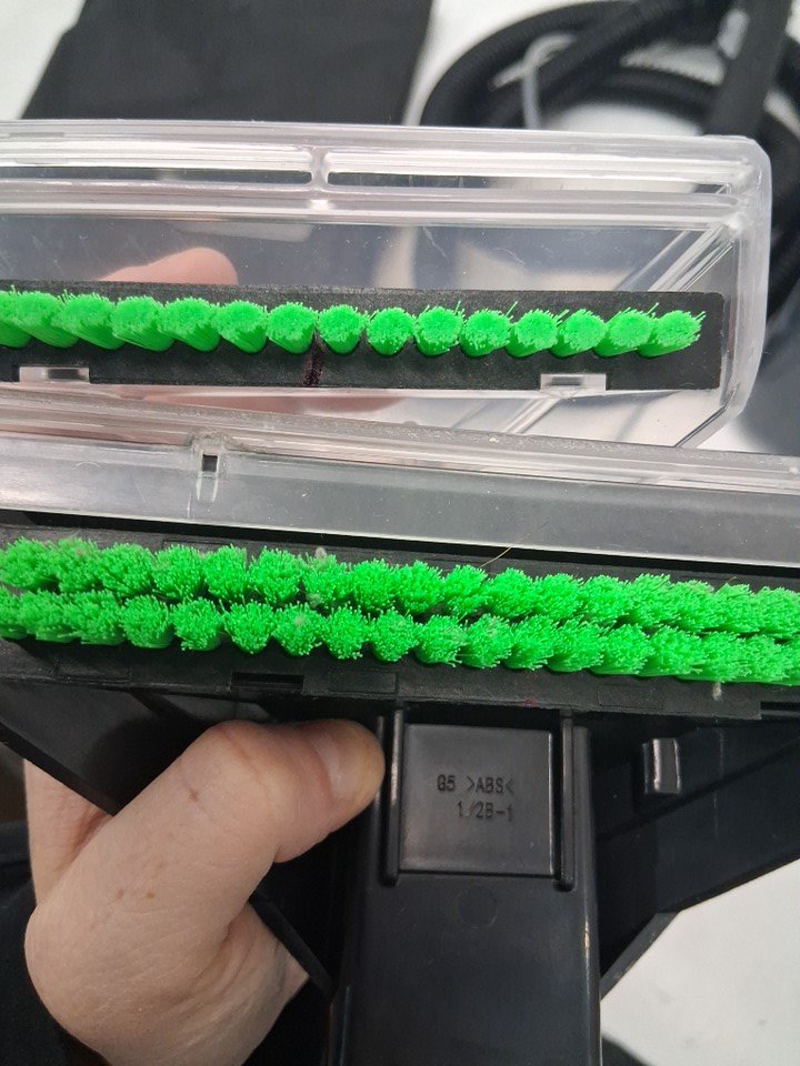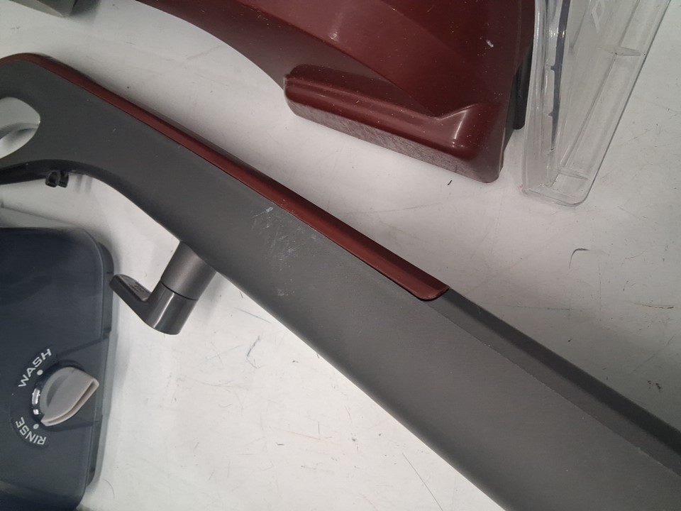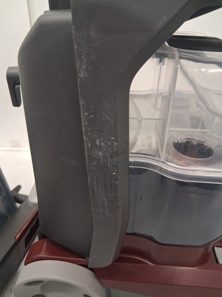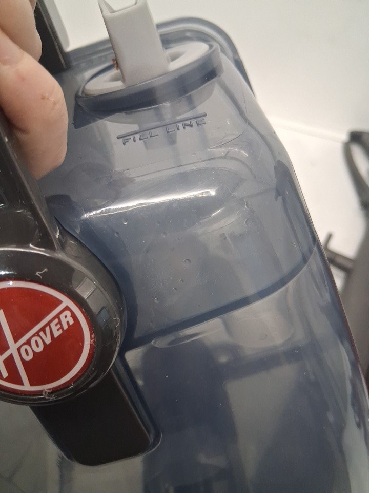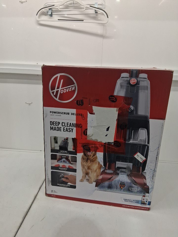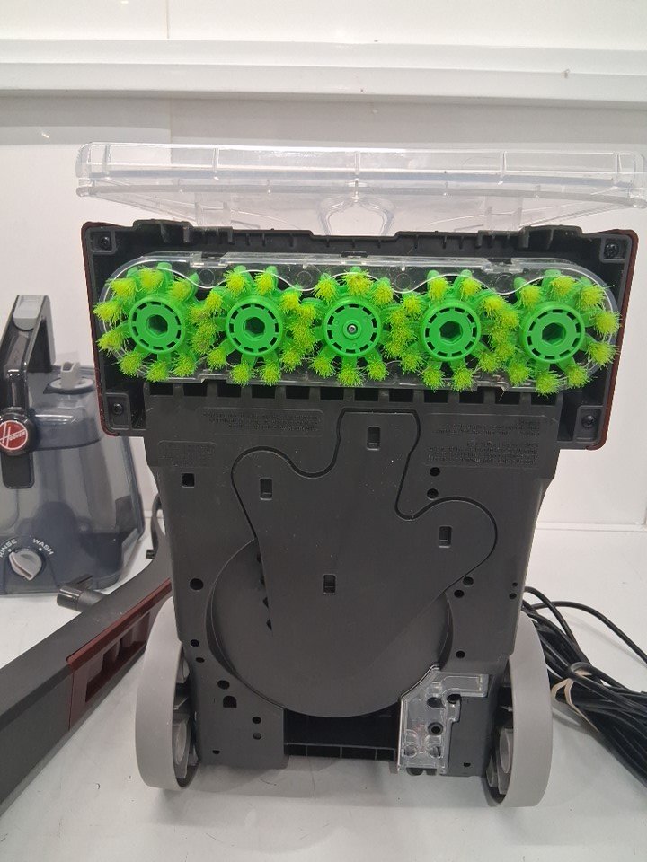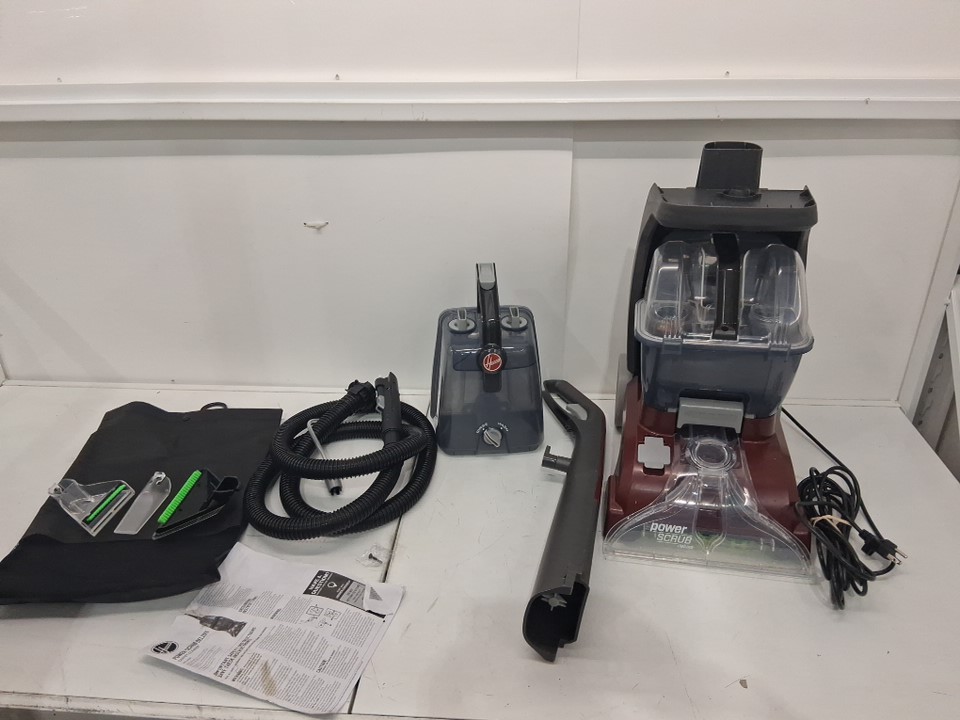 Carpet cleaner has some loose pet hair inside and on some bristles. Has water drops in water/shampoo chamber. It also has some scratches/scuff marks on arm and on side of cleaner. Does not come with cleaner. Has been tested for power (no indicator light)
