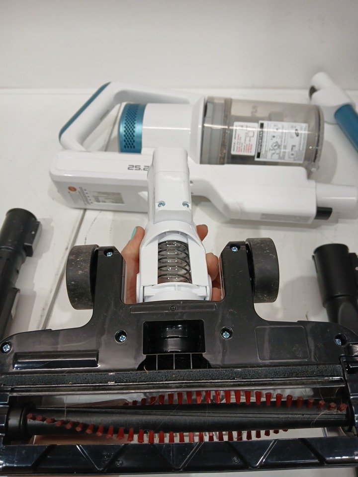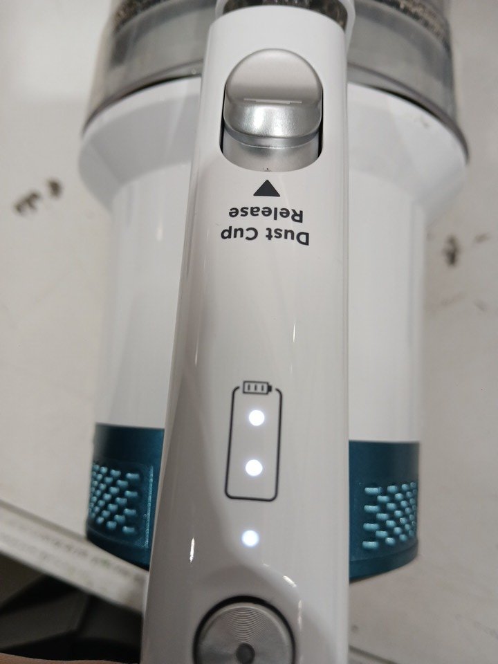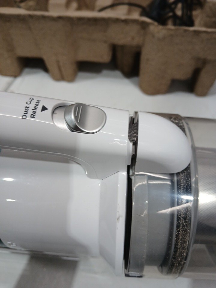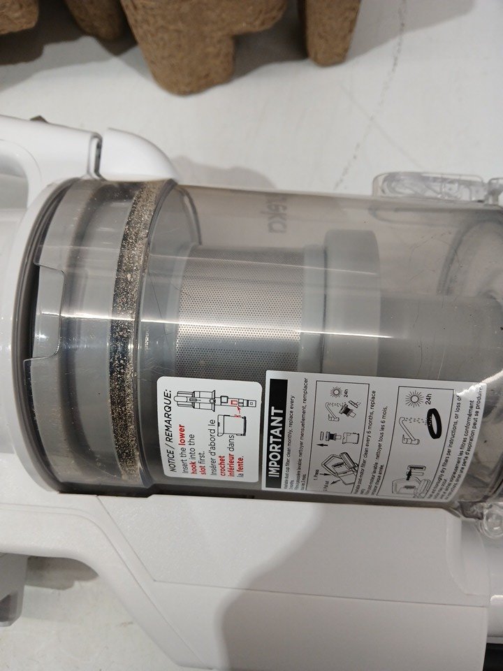 The top lock on the canister does not seem to lock. There is some dust and hair in the filter and bottom parts. Tested for power.