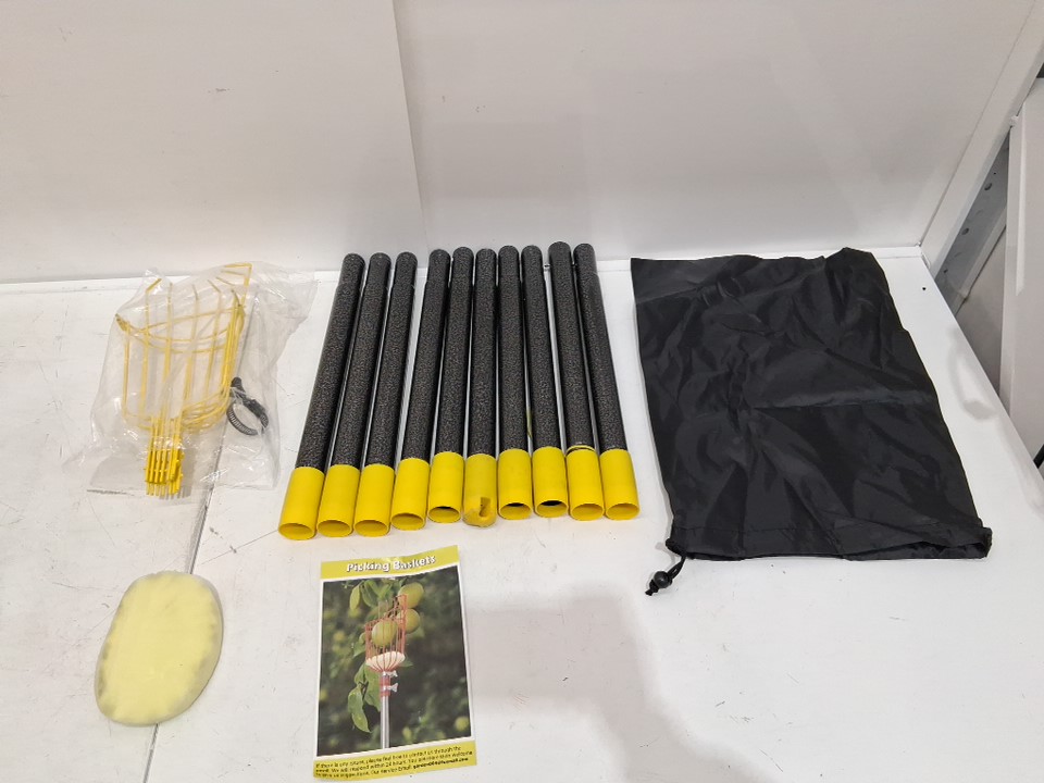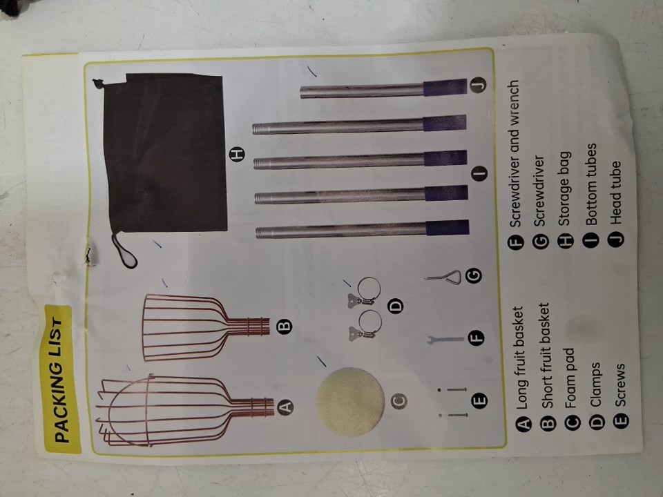 light dirt on sponge, pole ends, and fruit basket from previous use missing screws, screwdriver wrench, and one clamp see photos