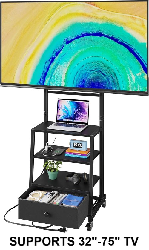 Aflui Rolling VESA Mount TV Stand with Wheels, Fabric Drawer and Power Outlet - Supports 32"-75" TV - Black (Model: TVS024-BK)