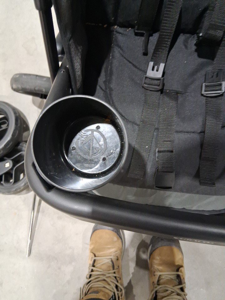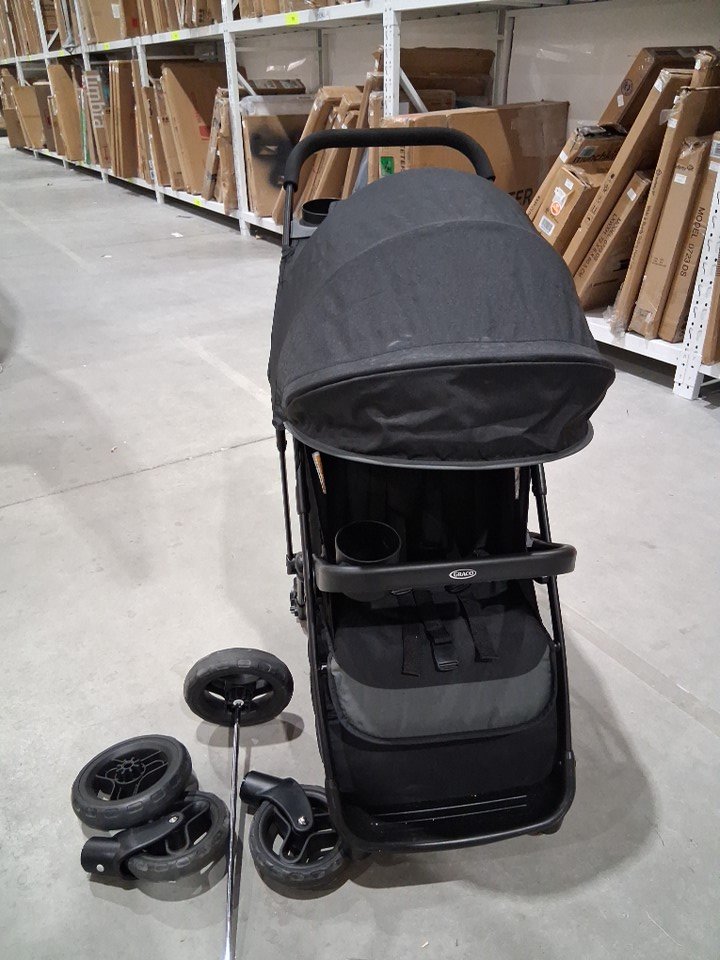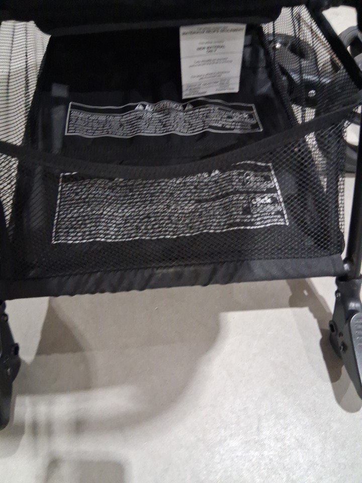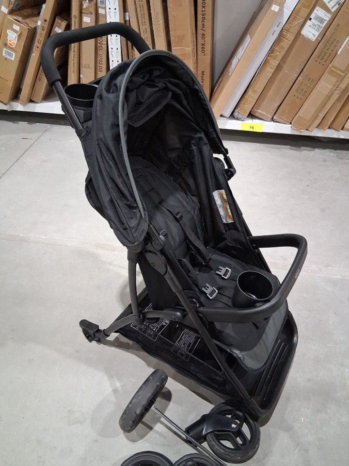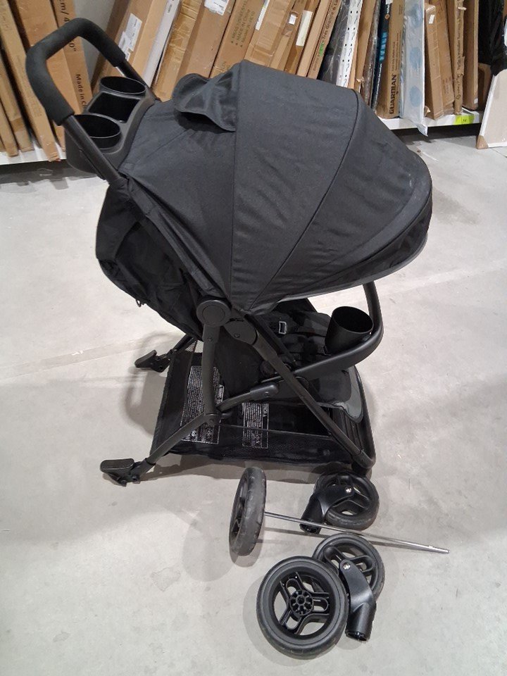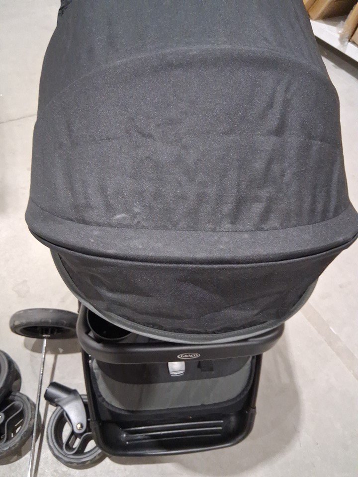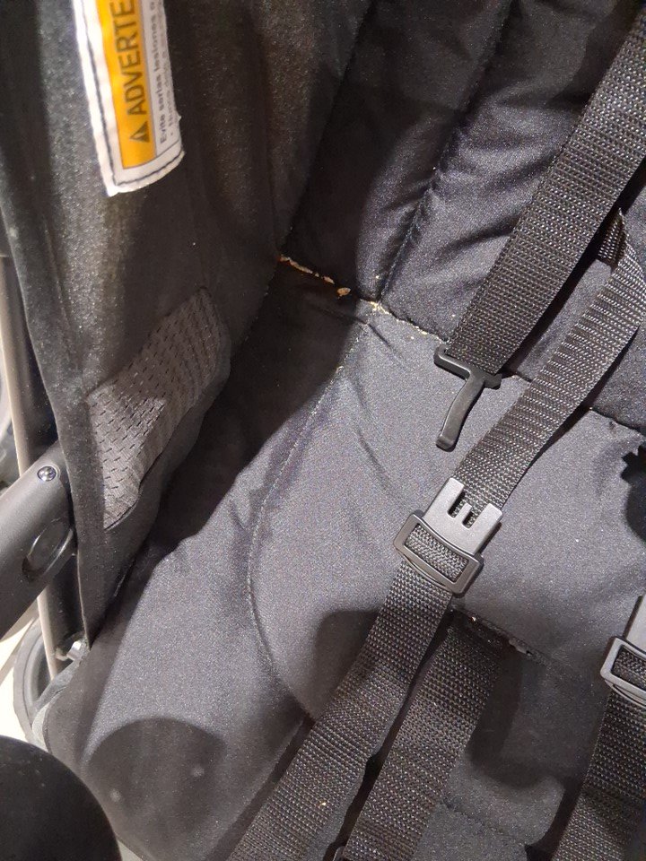 this has evidence of previous use. there are crumbs in the seat creases, marks in the cup holds and the tires show obvious signs of use. easy clean.