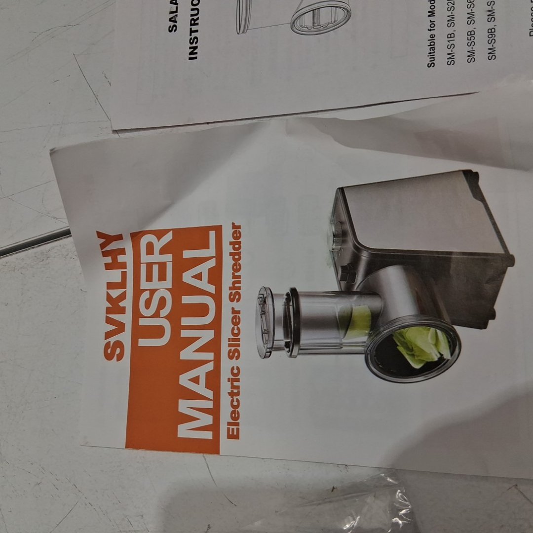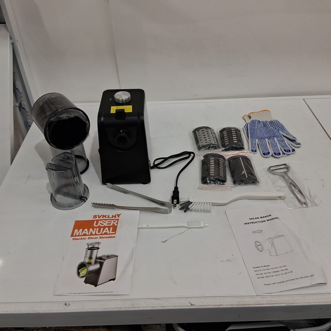 svklhy 5-in-1 Electric Cheese Grater and salad maker with 5-Interchangeable Blades and Peelers, Cleaning Brush and Gloves - black/silver - (model: mg-s9b)