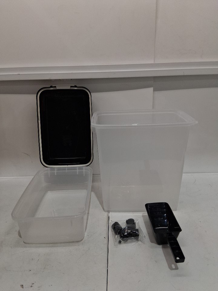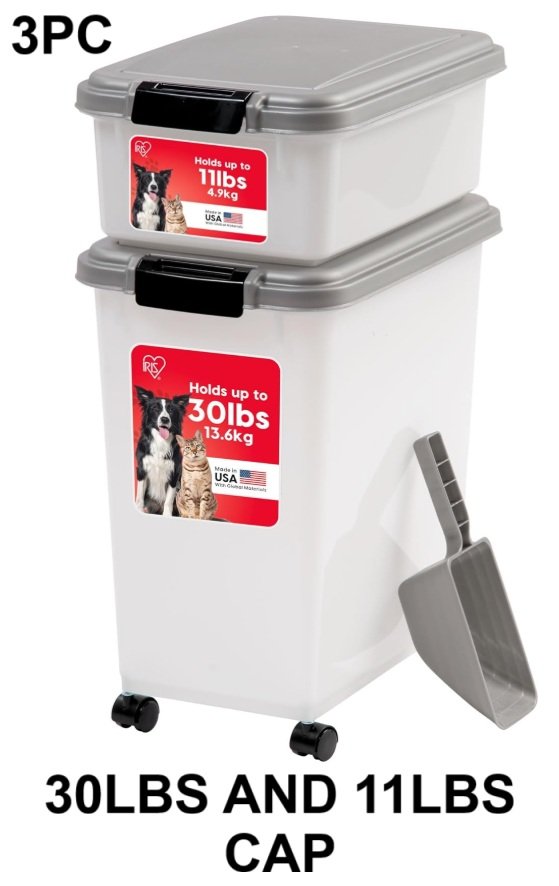 3pc iris usa dog food storage container with scoop - 30lbs and 11lbs cap - clear/black (MODEL: 301140)
