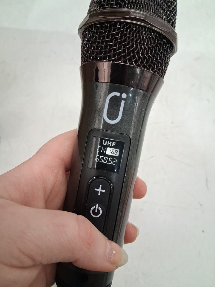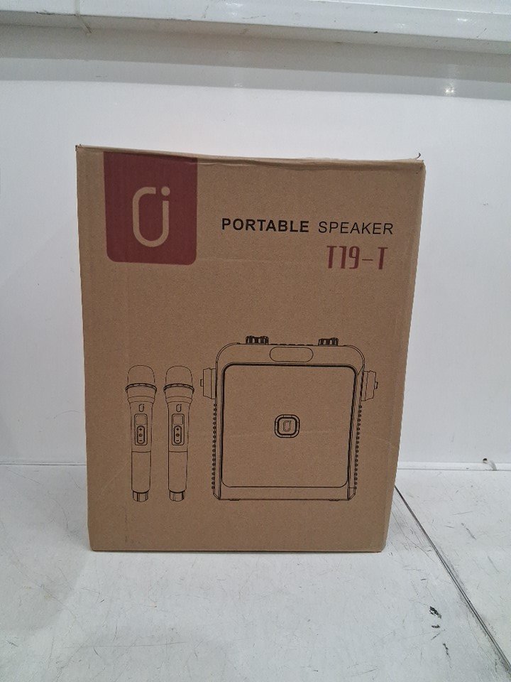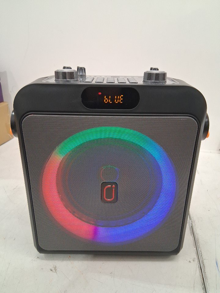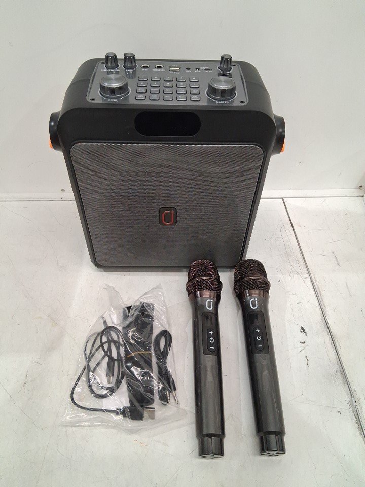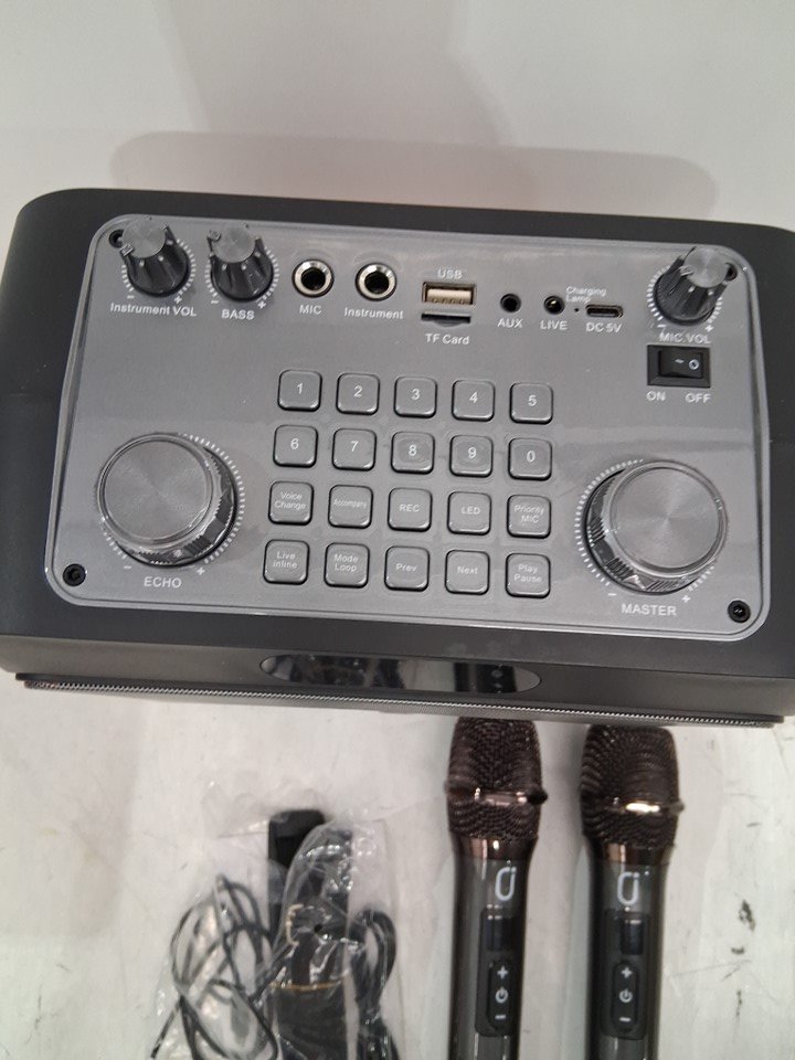 jyx Karaoke Machine with 2 Wireless Microphones, bluetooth connection, USB/TF/AUX, and carrying strap - black/grey (model: t19-t)