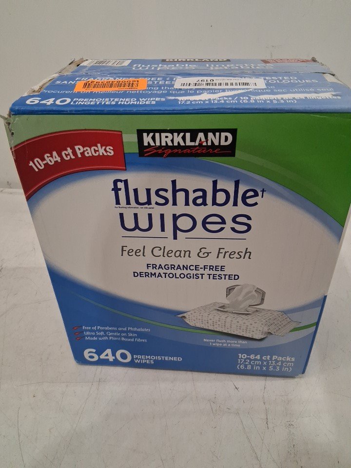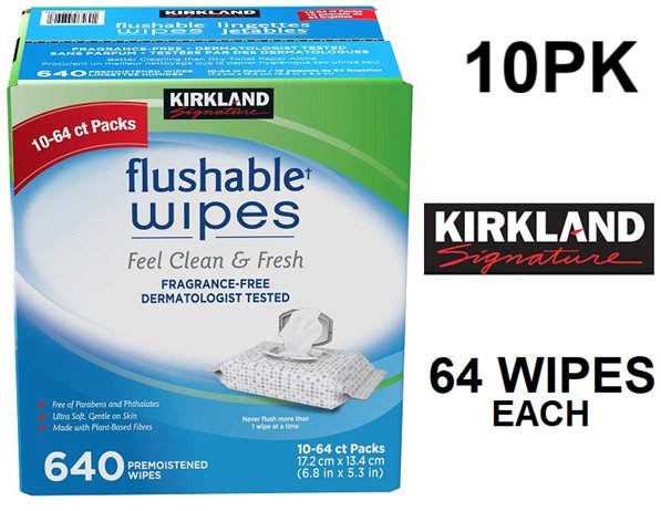 10pk KIRKLAND SIGNATURE FLUSHABLE WIPES, FRAGRANCE FREE - 64 per pack (640 wipes total)