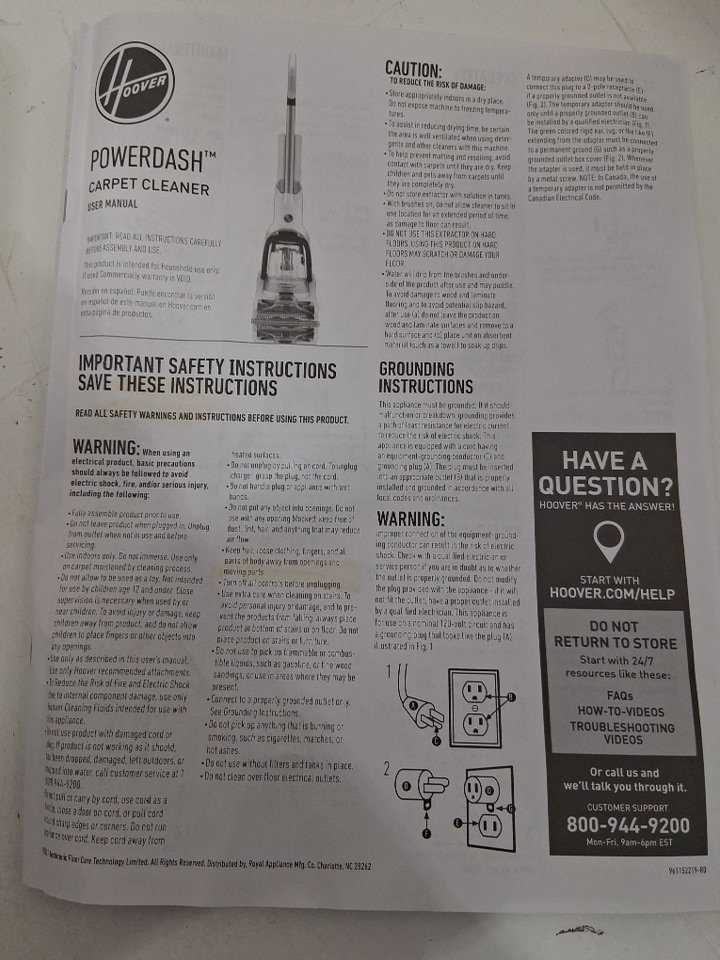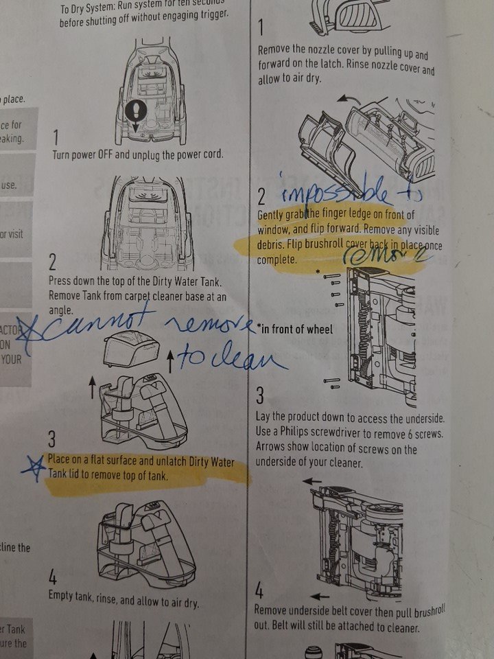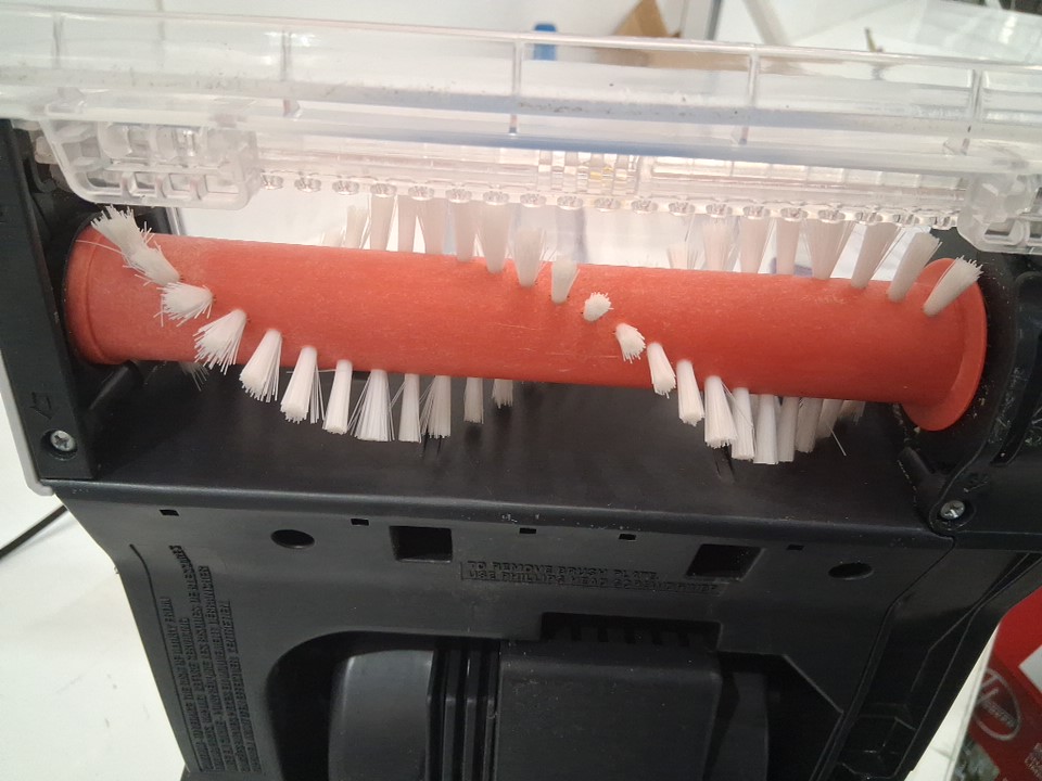 Basic power is functional, but the roller also did not rotate when powered on, indicating a potential mechanical issue. Additionally, as per the notes written in the manual, the lid on the water tank and the cover of the roller seem incapable of being removed, making cleaning the parts much more difficult. There is also some light dirt and water left in the tank, indicating previous usage - see photos. All parts appear present and in good repair, but customer may have to do some repair work in order for the cleaner to work as intended.