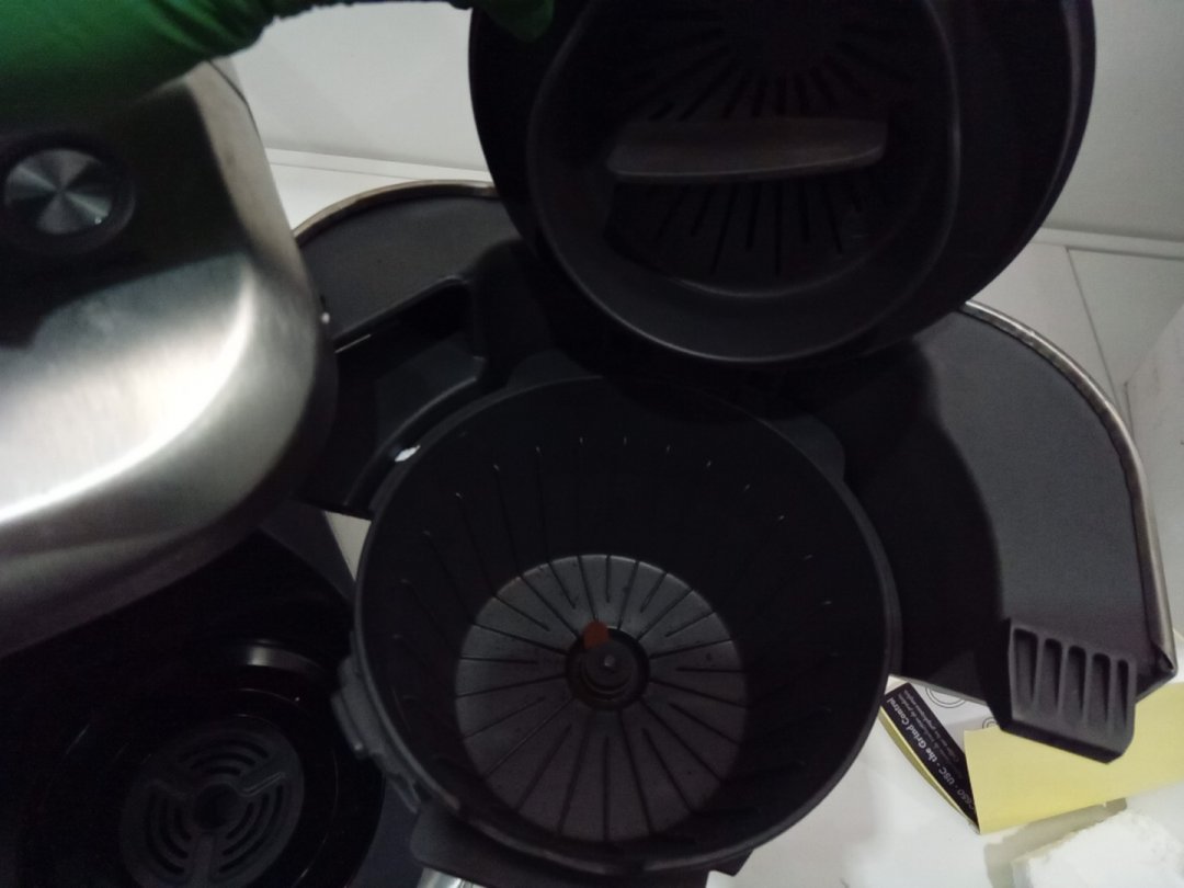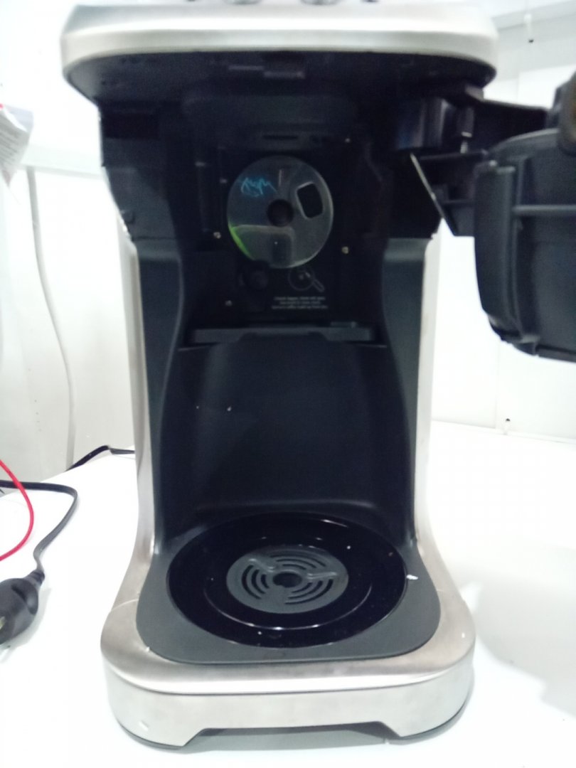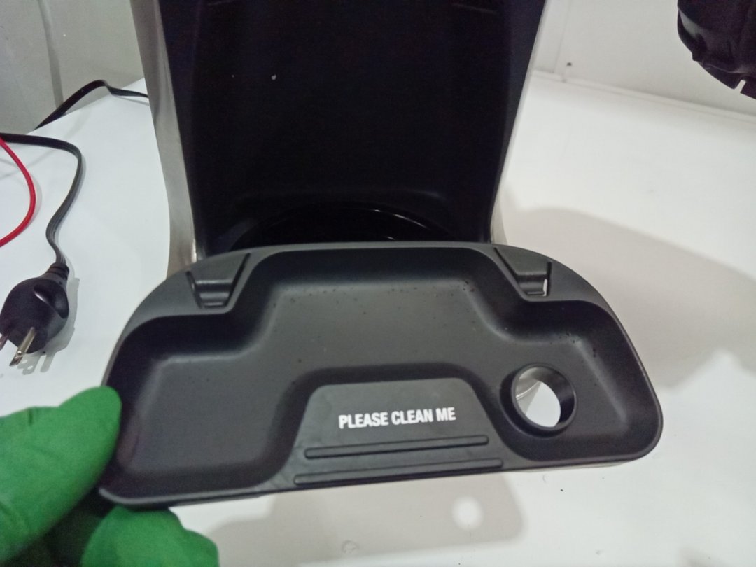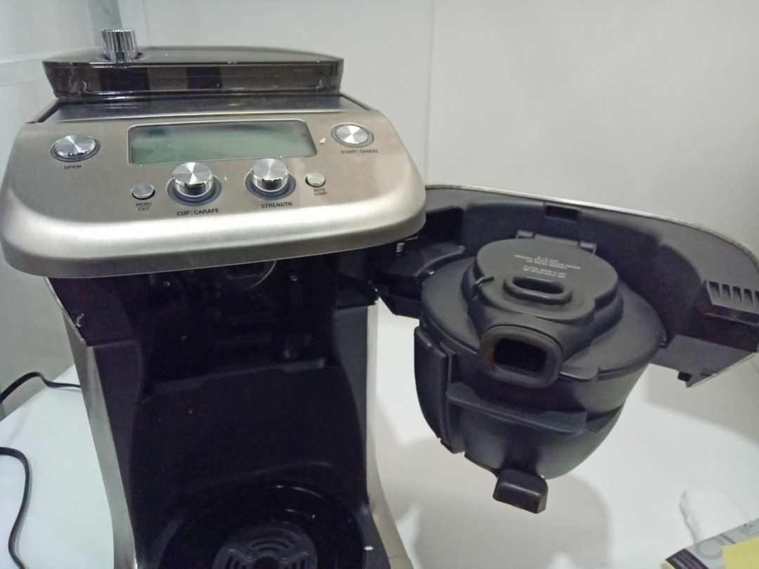 residual grinds from previous use. tested for power only. set is missing the carafe, which is replaceable.