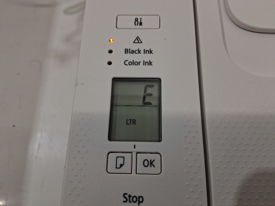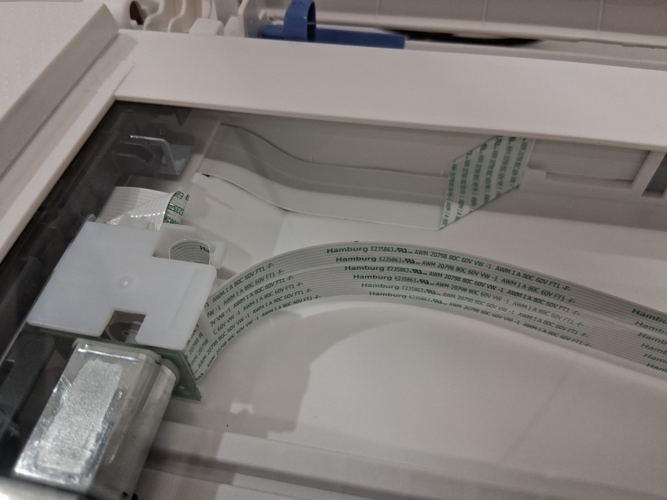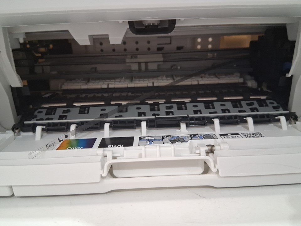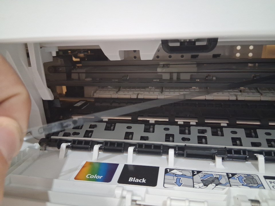 Basic power is functional, but the display shows an error likely related to the visible jamming underneath the transparent panel - see photos. Printer appears unused, but will not function properly unless the error can be cleared.