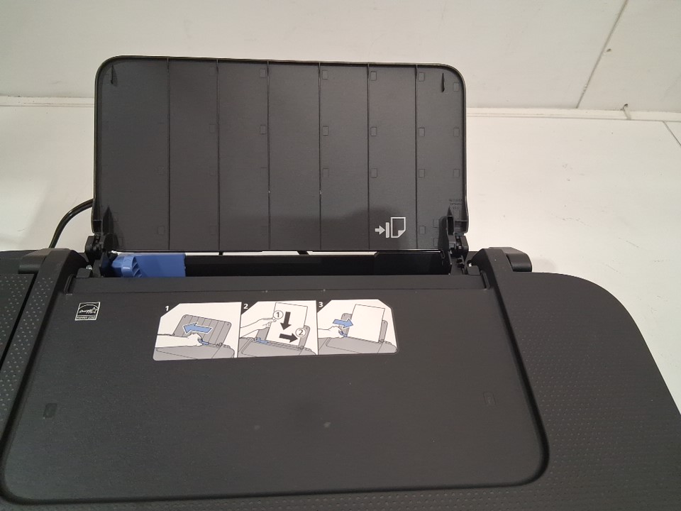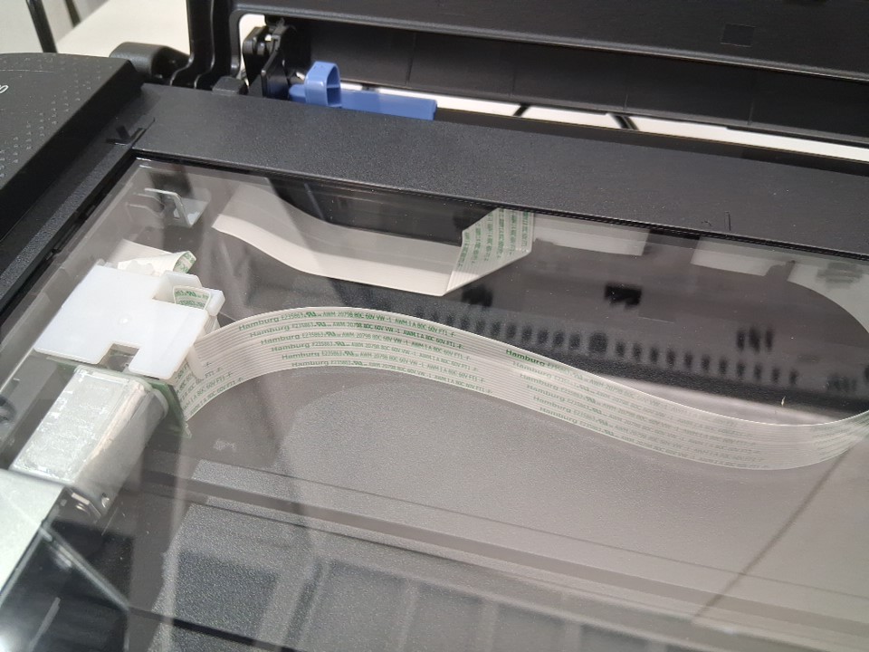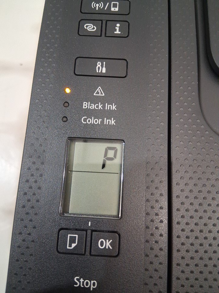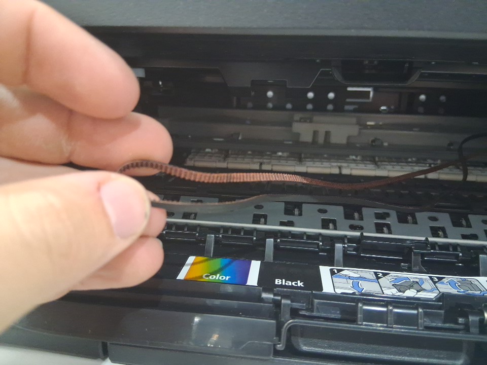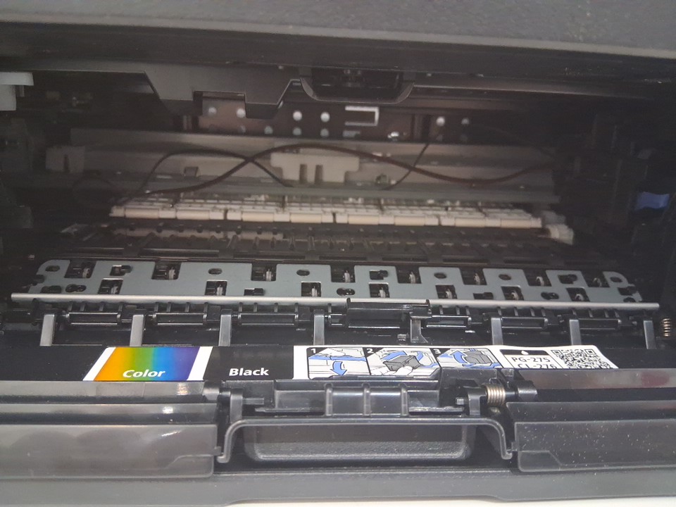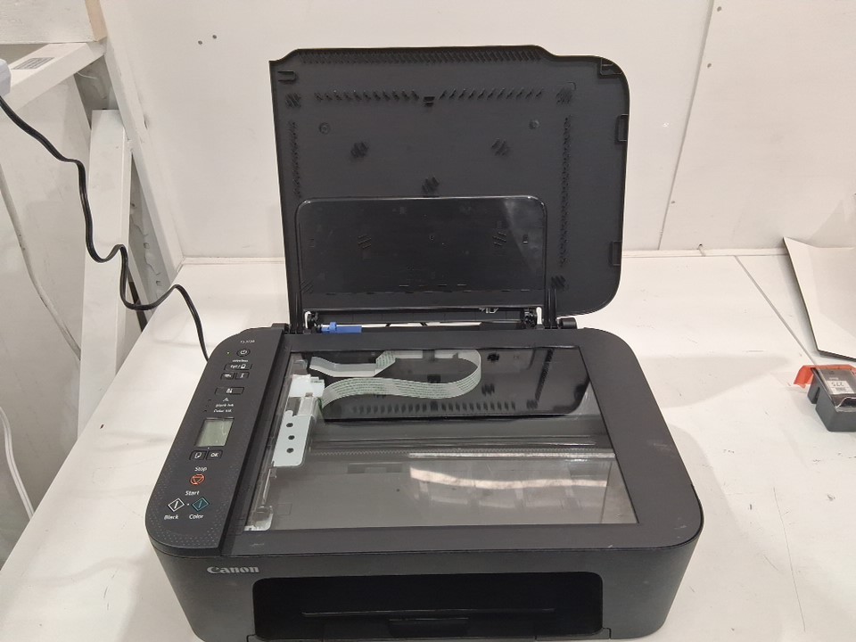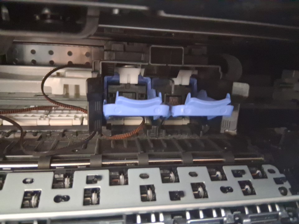 Basic power is functional, but the display shows an error likely related to the visible jamming underneath the transparent panel, or the internal threading being loose - see photos. Printer appears unused, but will not function properly unless the error can be cleared.