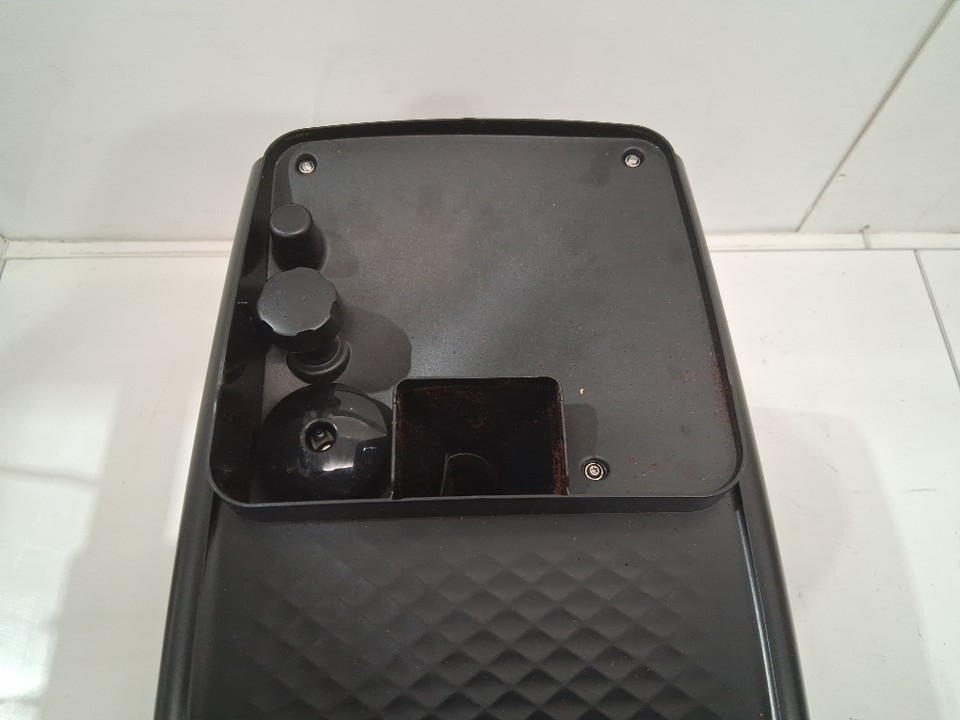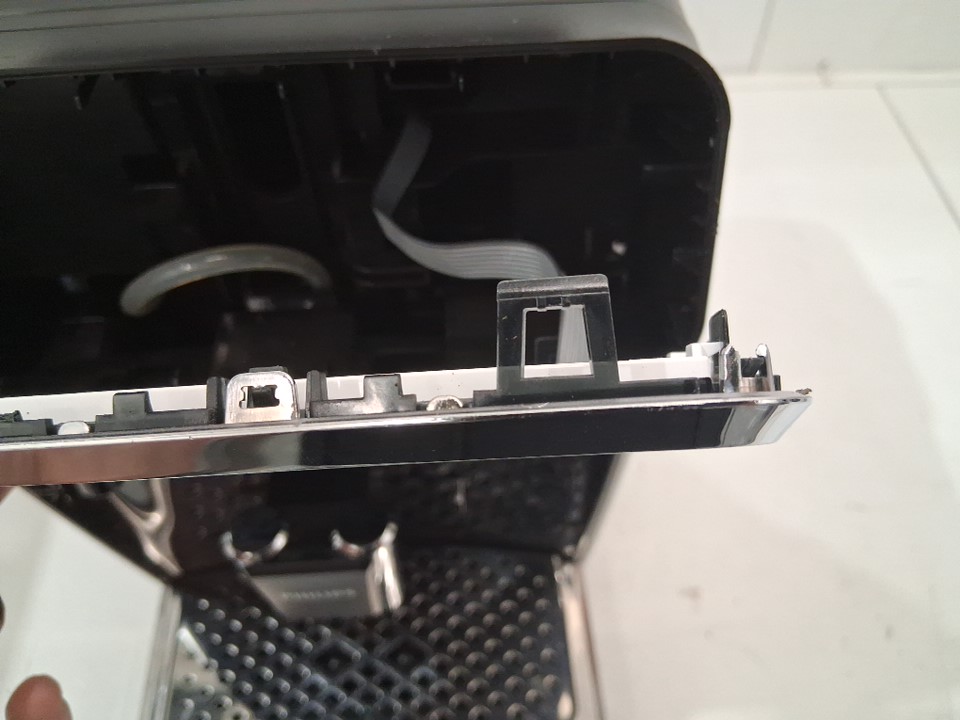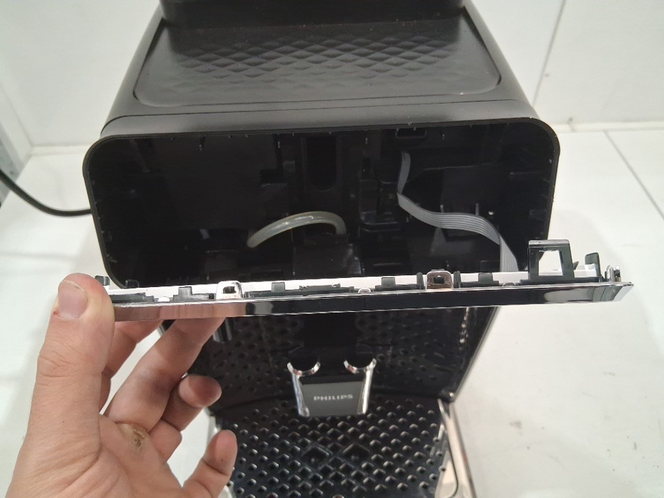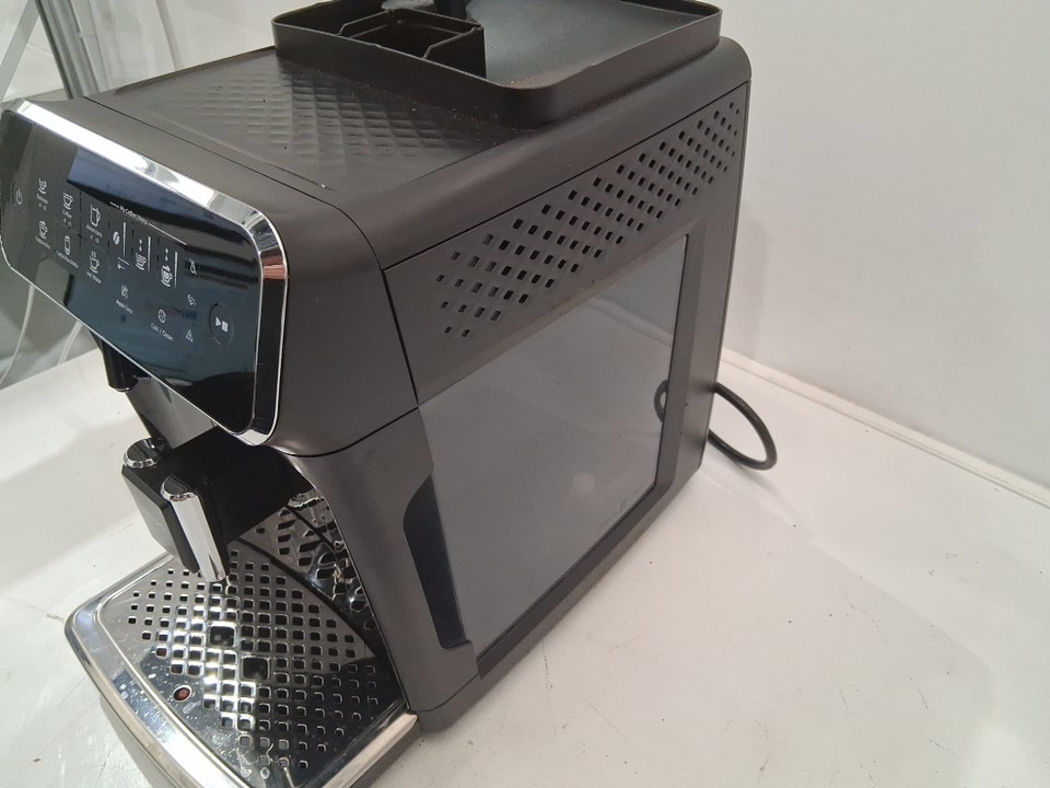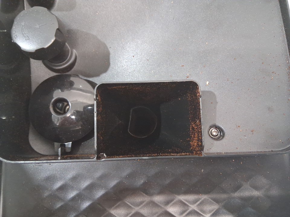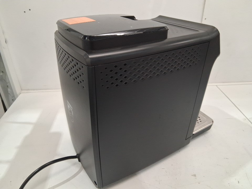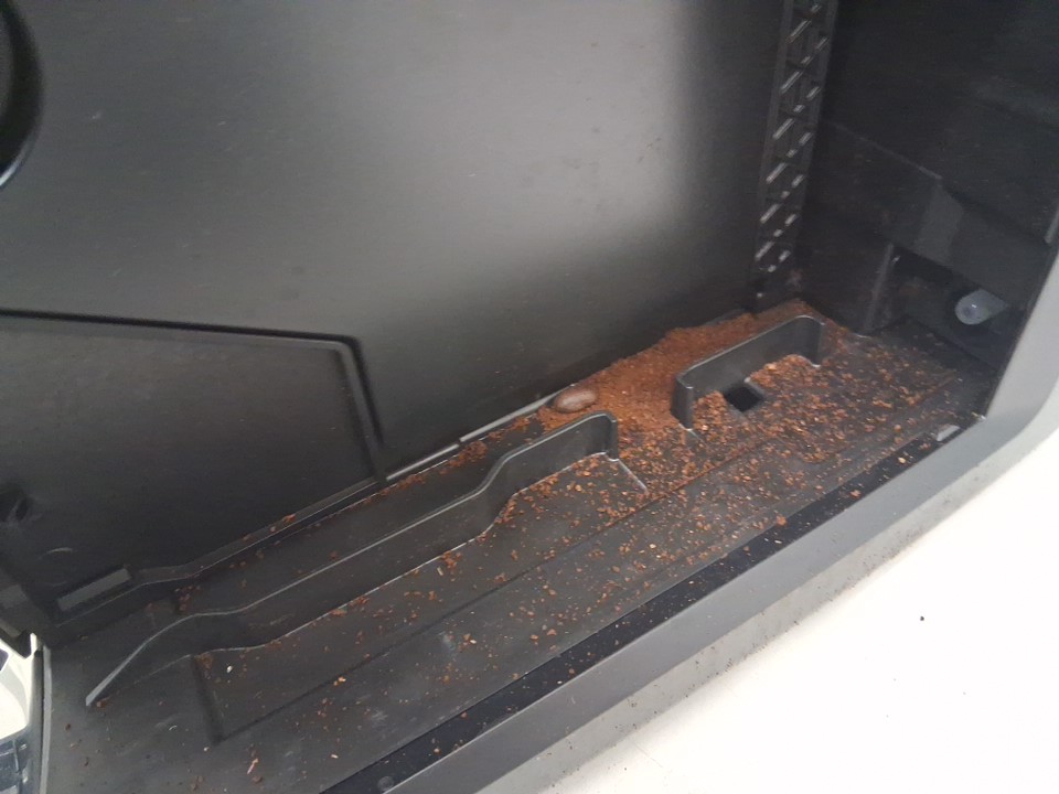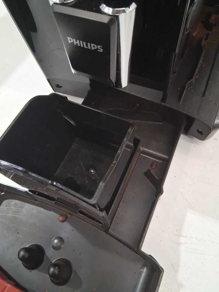 One of the plastic locking mechanisms on the front panel of the machine has snapped off, meaning the panel only snaps in place on one side, and can be pulled out without much force. There is also a lot of coffee residue in the top of the machine, the drip tray, and under the water tank, indicating previous use - see photos. Outside of these issues, the coffee maker appears to be in very good condition and powers on as normal.