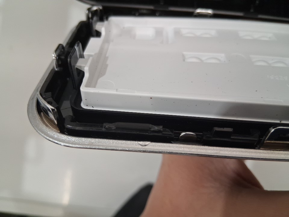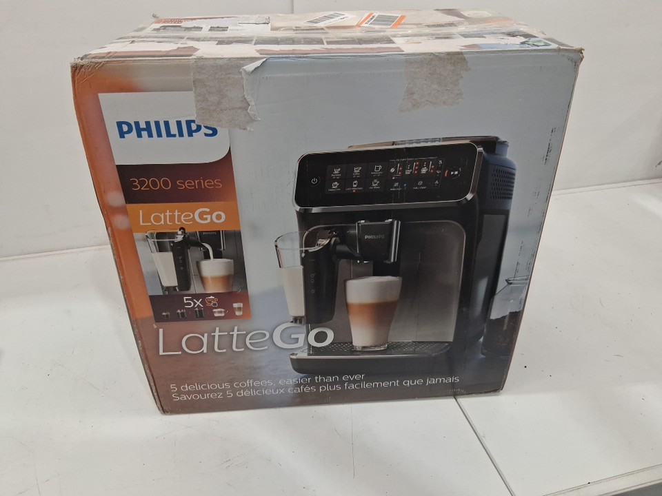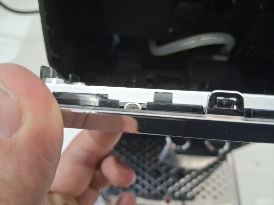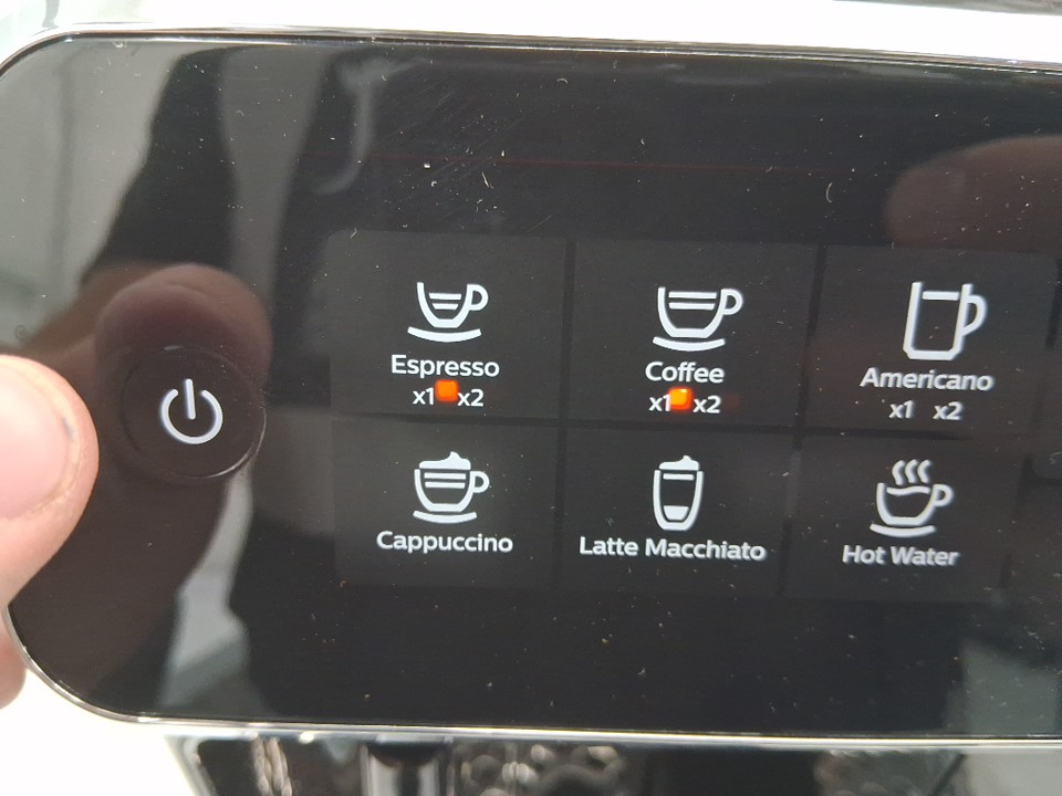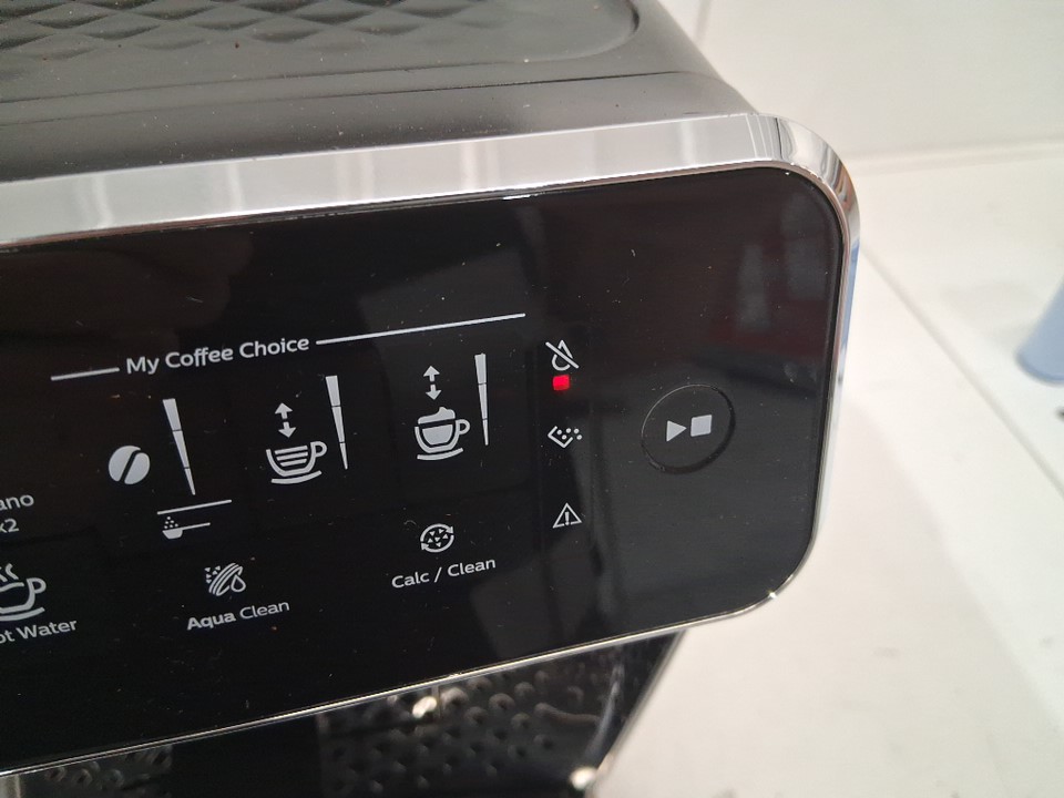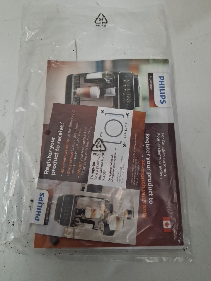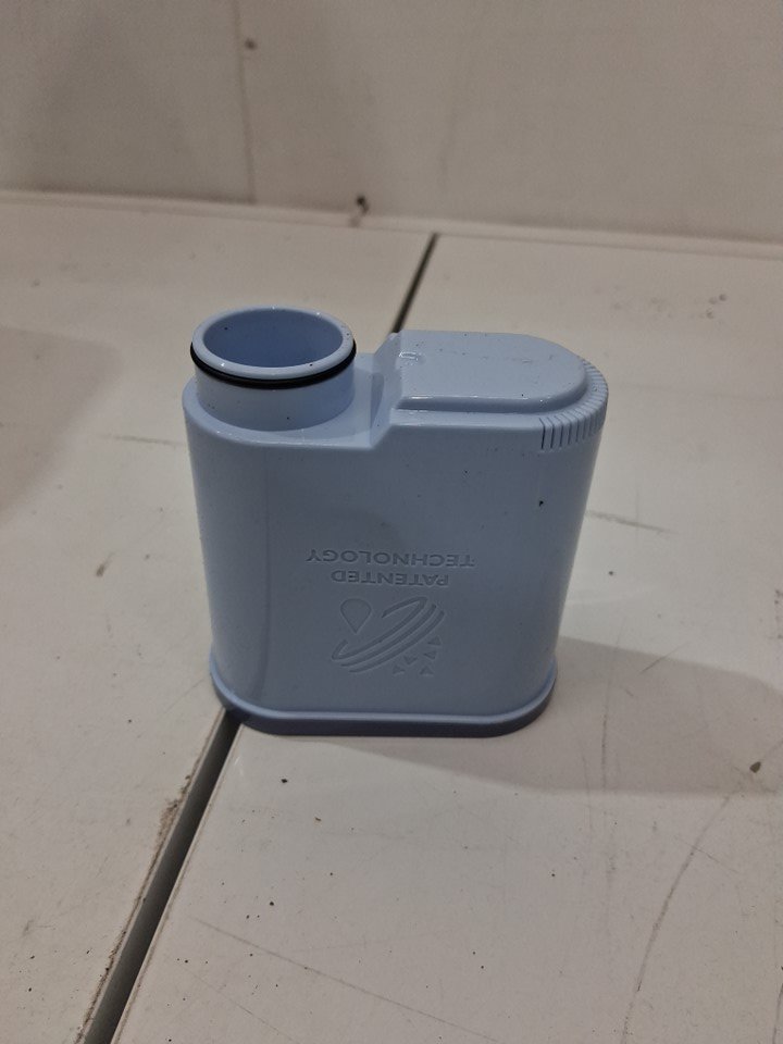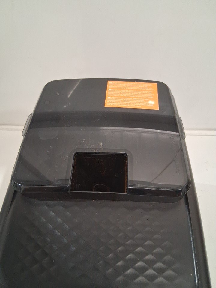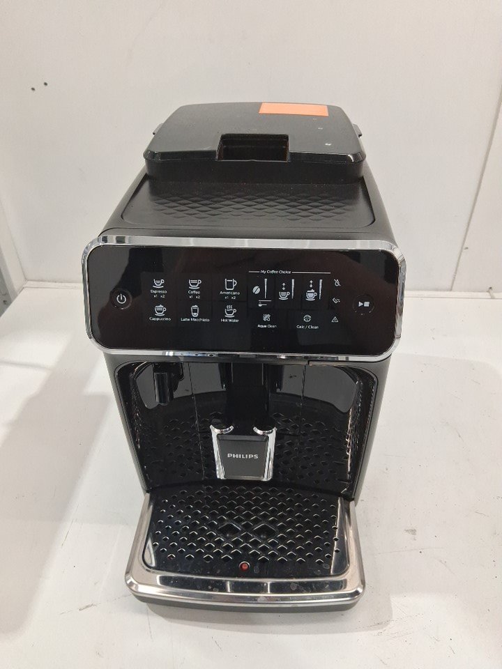 One of the plastic locking mechanisms on the front panel of the machine has snapped off, meaning the panel only snaps in place on one side, and can be pulled out without much force. There is also a lot of coffee residue in the top of the machine, the drip tray, and under the water tank, indicating previous use - see photos. Outside of these issues, the coffee maker appears to be in very good condition and powers on as normal.
