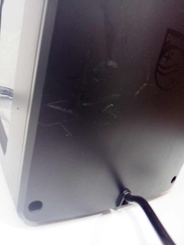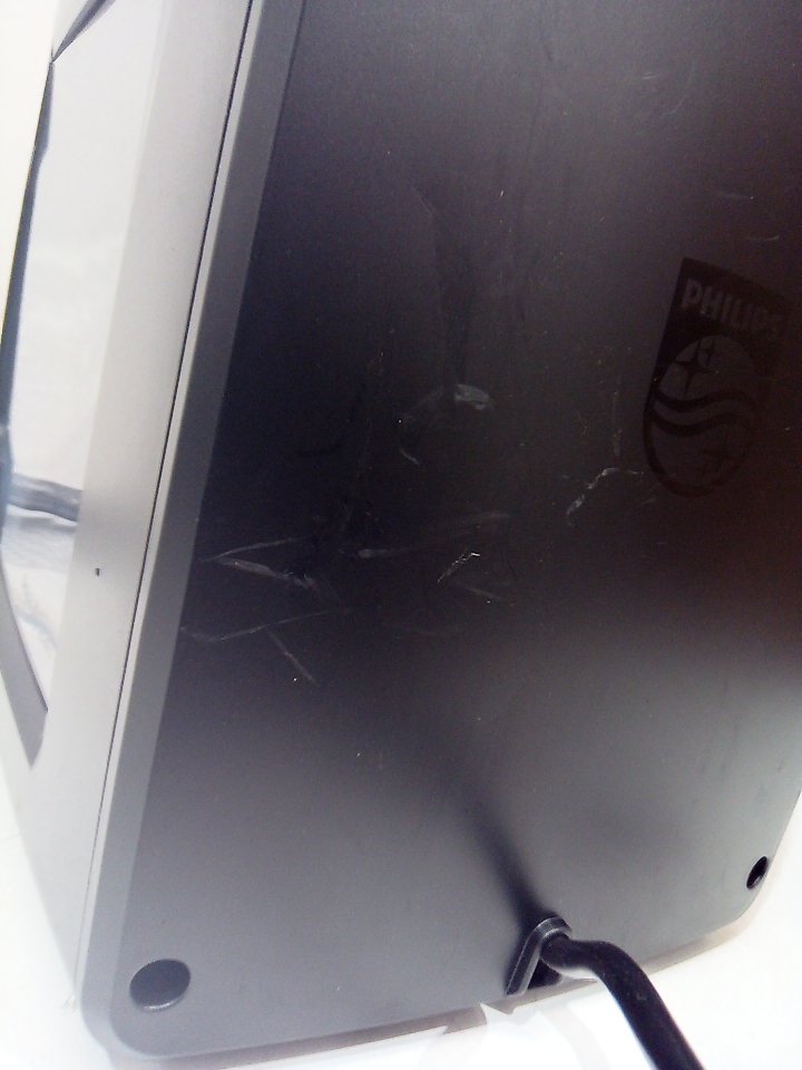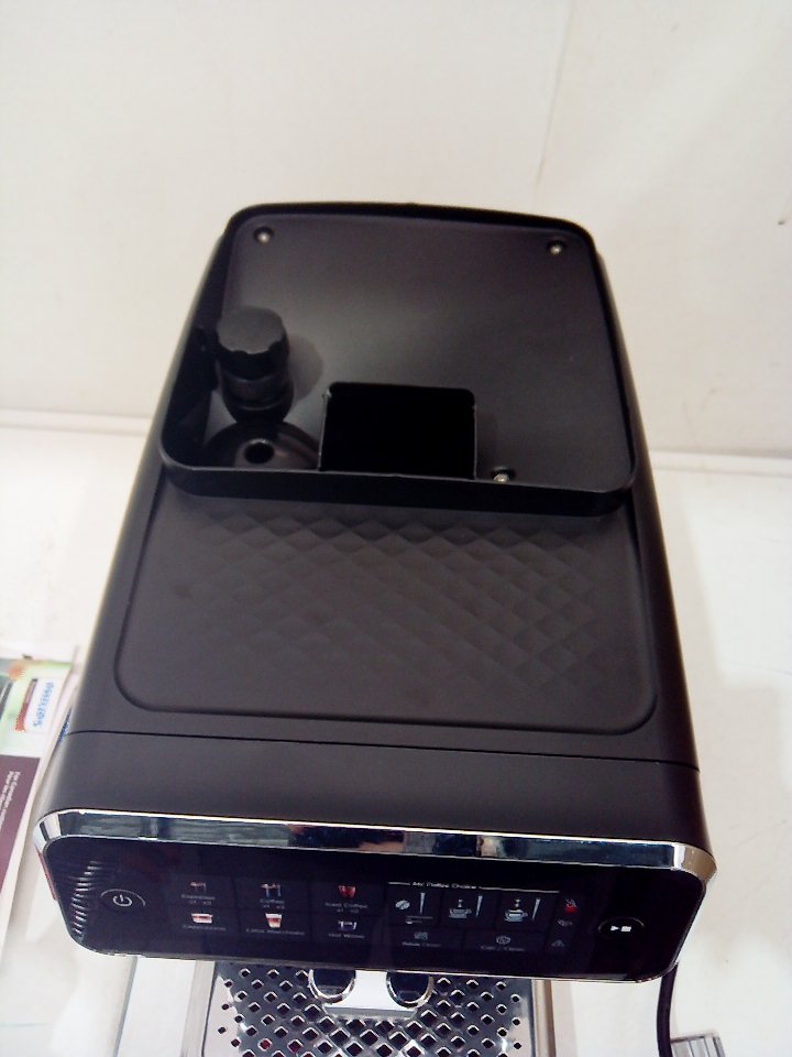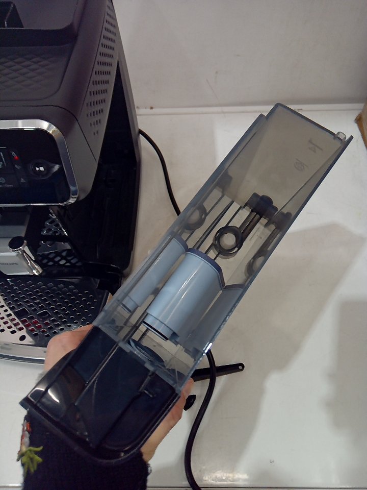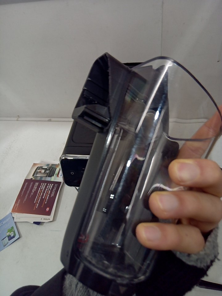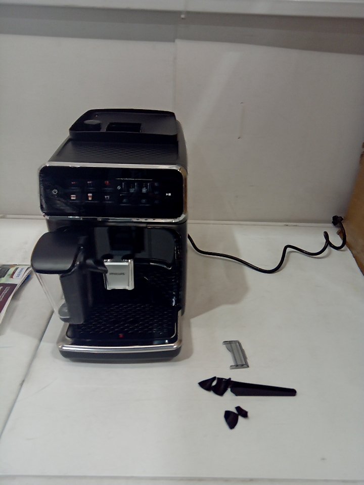 There are scratches, dust and coffee residue on the outside. The scoop is broken/cracked. The small plastic flap for the top is cracked and half of it is missing, there is also minor damage to the hinge its supposed to rest on. The plastic on the back of the milk cup has a piece cracked off. Tested for power. (SEE PHOTOS)