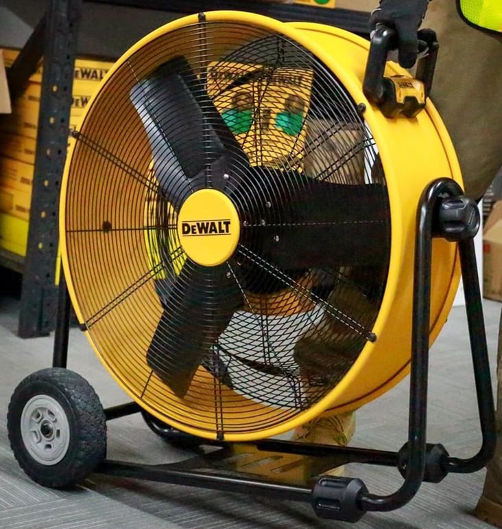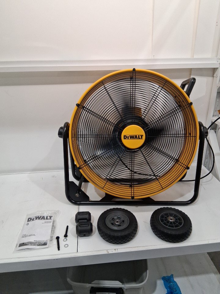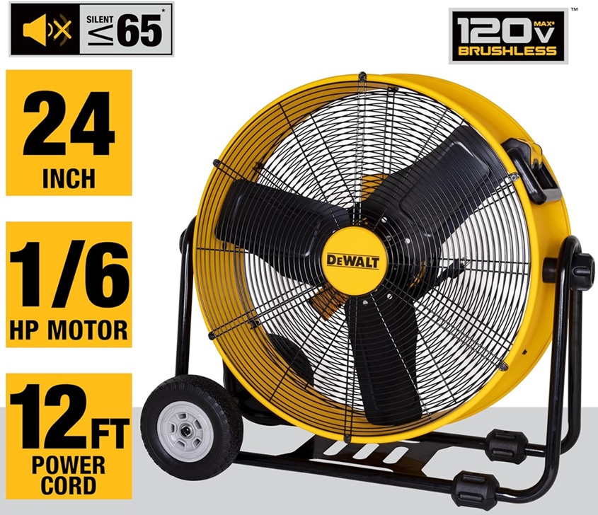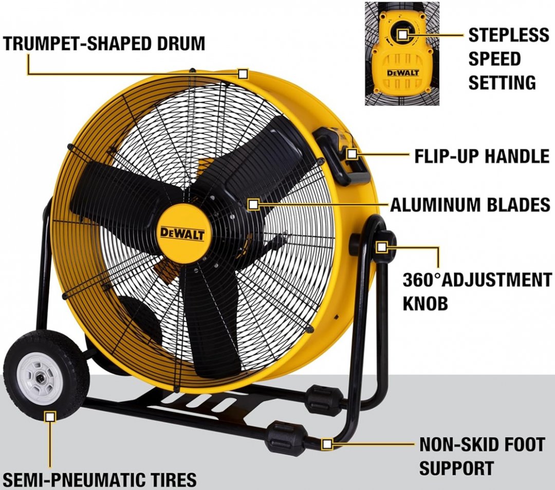 DEWALT Electric Metal Rotating High Velocity Industrial Floor Fan with 360° Adjustable Tilt & Wheels - 1/6 HP MOTER - 12FT CORD - 24" - Black/Yellow (Model: DXF2490)
