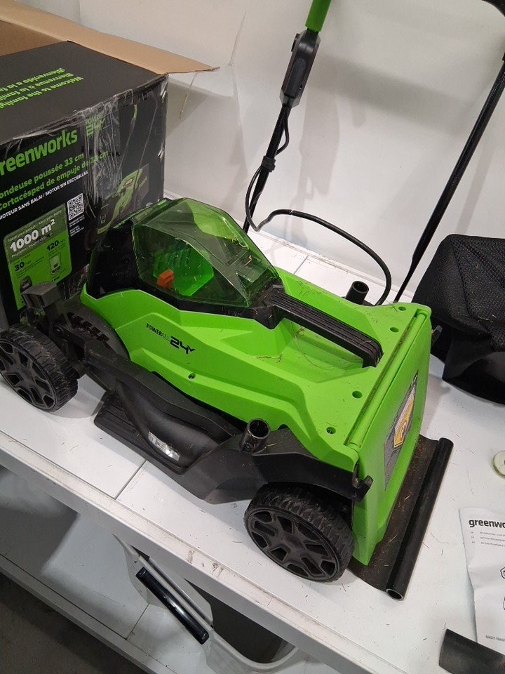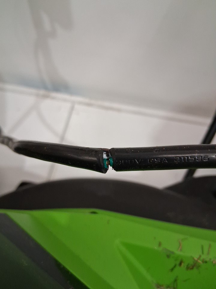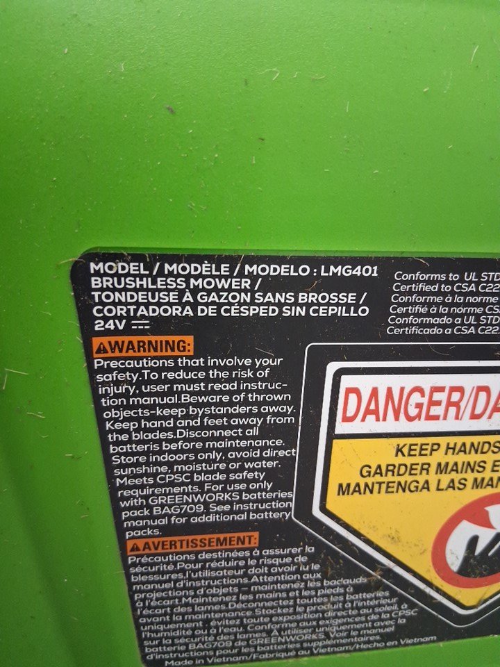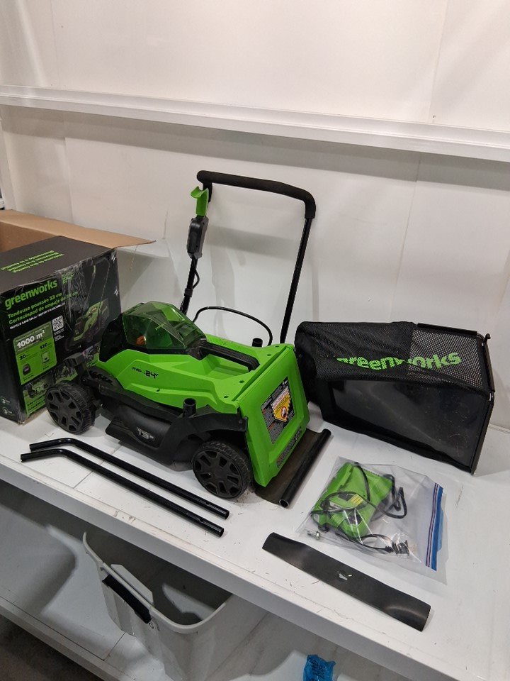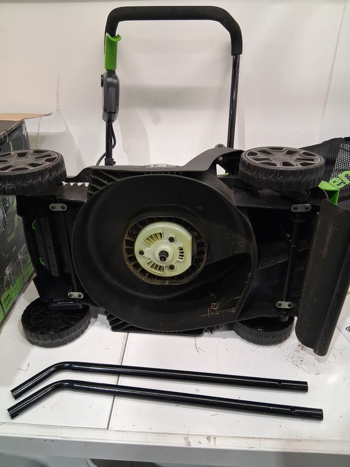 Tested for power and function. Lawn clippings, disassembled parts, and damage to cord indicate previous use (See photos).