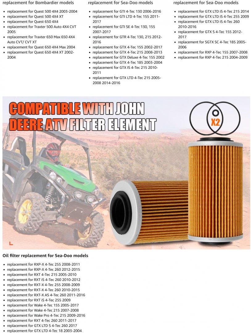 2PK HOYPEYFIY ATV/MOTORCYCLE OIL FILTER REPLACEMENT FOR JOHN DEERE, SEA-DOO, BOMBARDIER SELECT MODELS (MODEL: 420956741, 711956741, KN-556, HF556)
